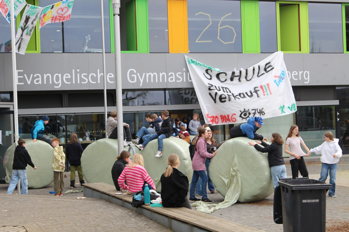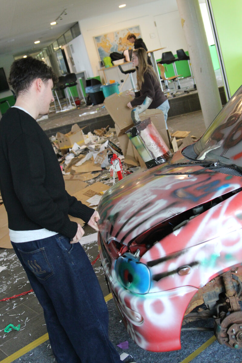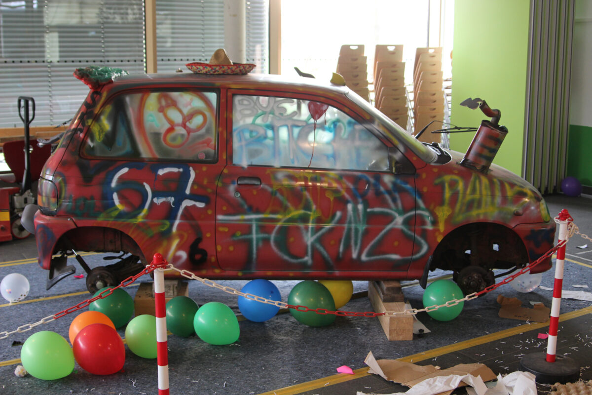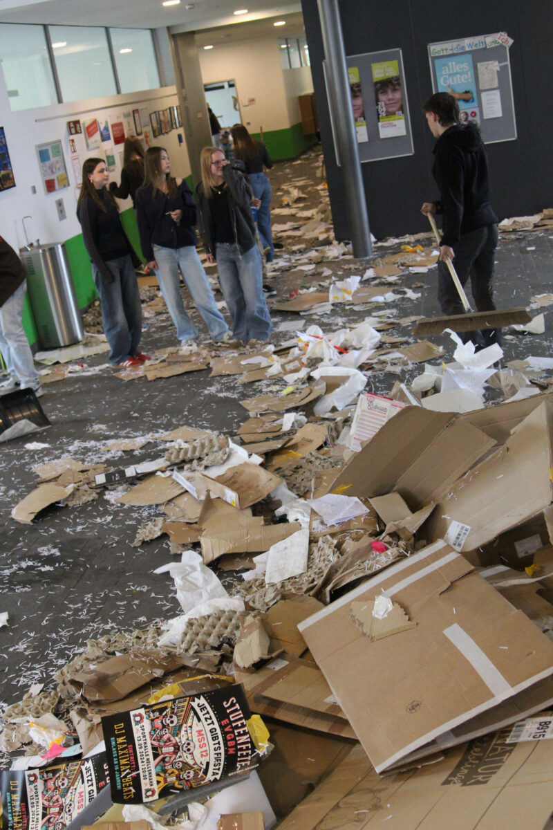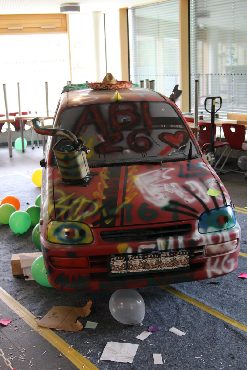 Als am Dienstag, den 24.03.2026, die Lernenden und Lehrenden an das EvGBM kamen, um einen weiteren Tag mit dem fleißigen Erwerben von Kompetenzen und Wissen zu verbringen, erwartete sie eine gehörige Überraschung: Die Schule war abgesperrt; besetzt von dem frischgebackenen Abiturjahrgang 2026. Die Überraschung war groß und groß war auch das Chaos, auf das die Schulgemeinschaft stieß: Der Schulhof war dick mit Rindenmulch bedeckt, die Eingangstür war mit Heuballen versperrt, das Foyer war übersät mit obsolet gewordenen Unterrichtsmitschriften und im grünen Salon wartete das Highlight: ein – nicht mehr ganz verkehrssicherer – Kleinwagen stand im Schulgebäude. Künstlerisch war das Auto zwar „aufgehübscht“ worden, aber die Räder des Boliden fehlten. Um die Hoheit über die Schule (und die Räder für das Auto) zu erlangen, mussten die Lehrenden in der Turnhalle vor der versammelten Schulgemeinschaft in spannenden Wettkämpfen gegen den Abiturjahrgang antreten.