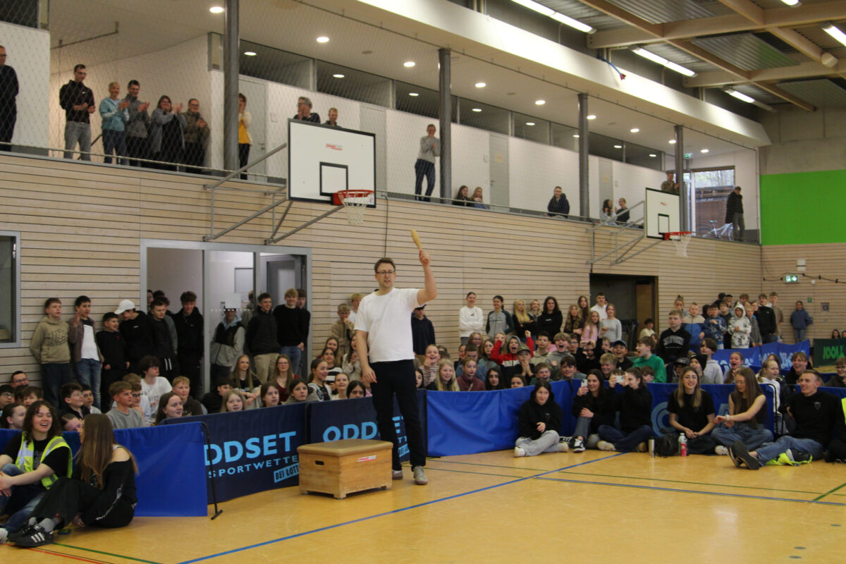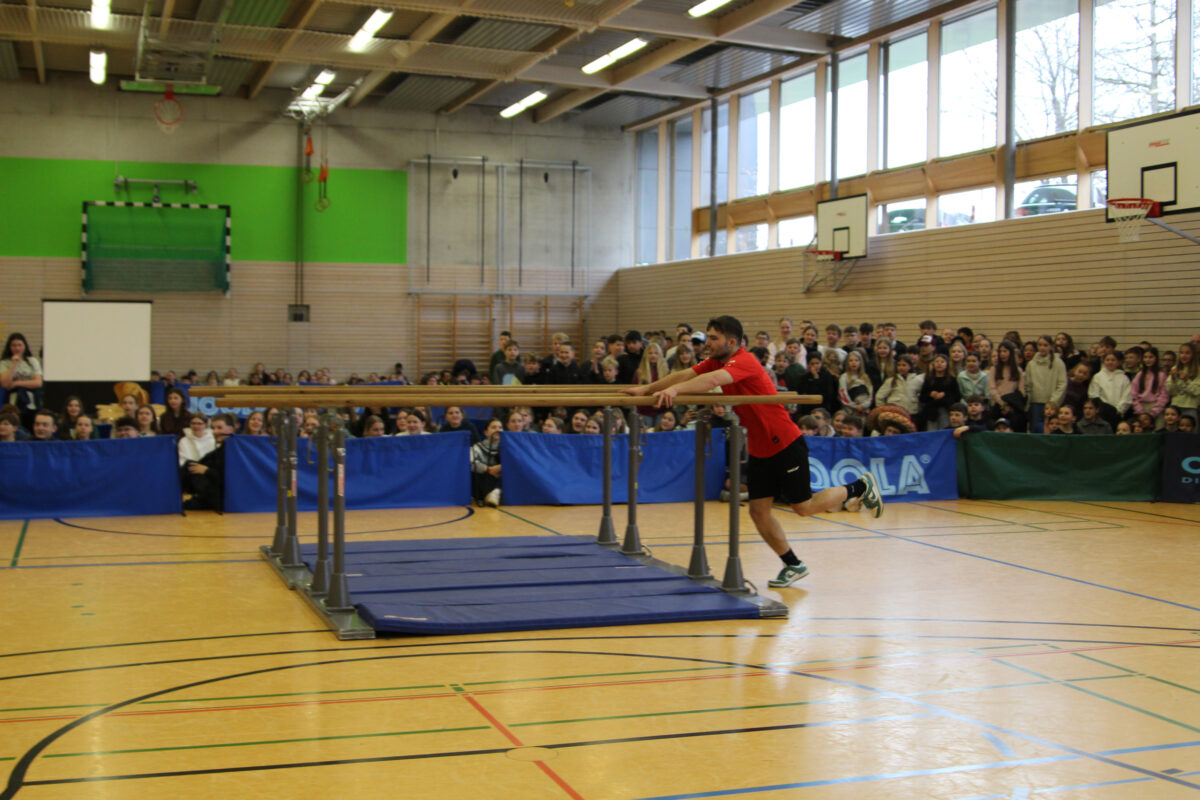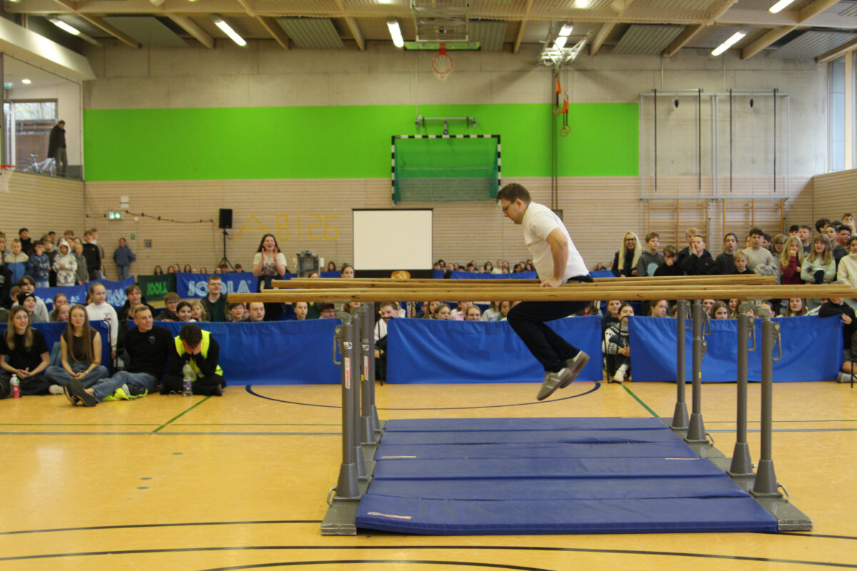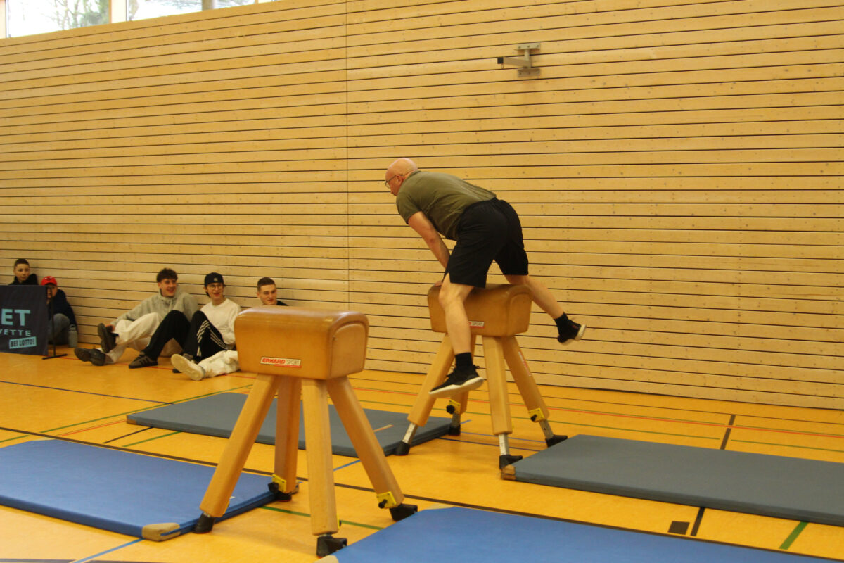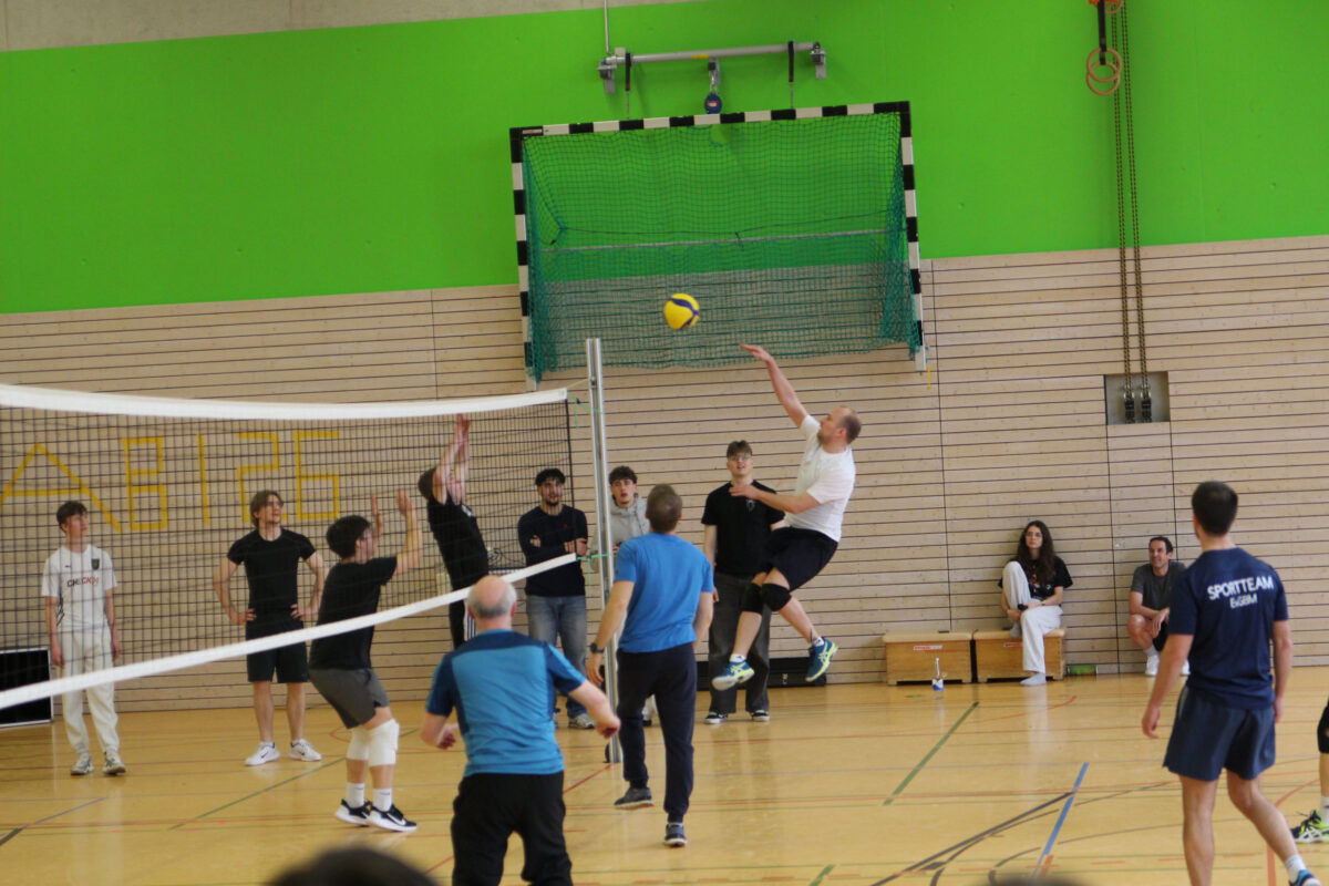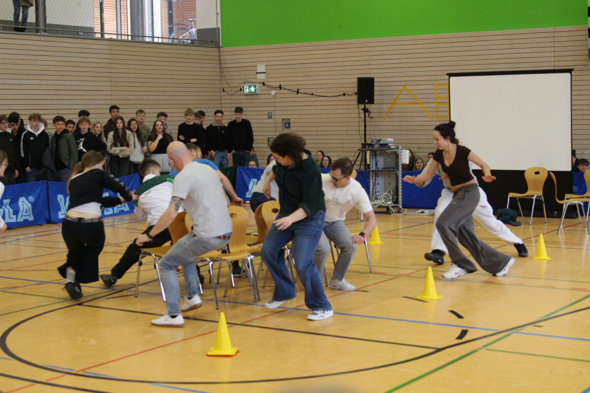 In insgesamt sechs Disziplinen galt es, die gegnerischen Teams zu besiegen. Sportlich wurde es gleich zu Beginn – auf der Hindernisbahn. Die Lehrer konnten zwar zunächst ein Unentschieden gegen die – wesentlich jüngeren – Abiturientinnen und Abiturienten erlangen, mussten sich dann aber in der Entscheidungsrunde geschlagen geben. Das zweite Spiel, Reise nach Jerusalem, begann für die Lehrenden zunächst vielversprechend und viele konnten sich lange im Spiel halten. Die Schnelligkeit der jüngeren Generation verschaffte dem Schülerteam aber schlussendlich den Sieg.