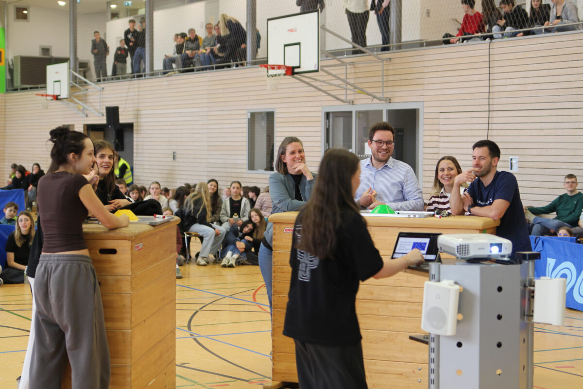 Zwei Quizrunden folgten. Während das Allgemeinwissensquiz unentschieden endete – wobei einige Lösungen lautstark von Seiten der Lehrenden in frage gestellt wurden (Besserwissen ist schließlich der Beruf) – konnten die Schülerinnen im Liederquiz überzeugend gewinnen.