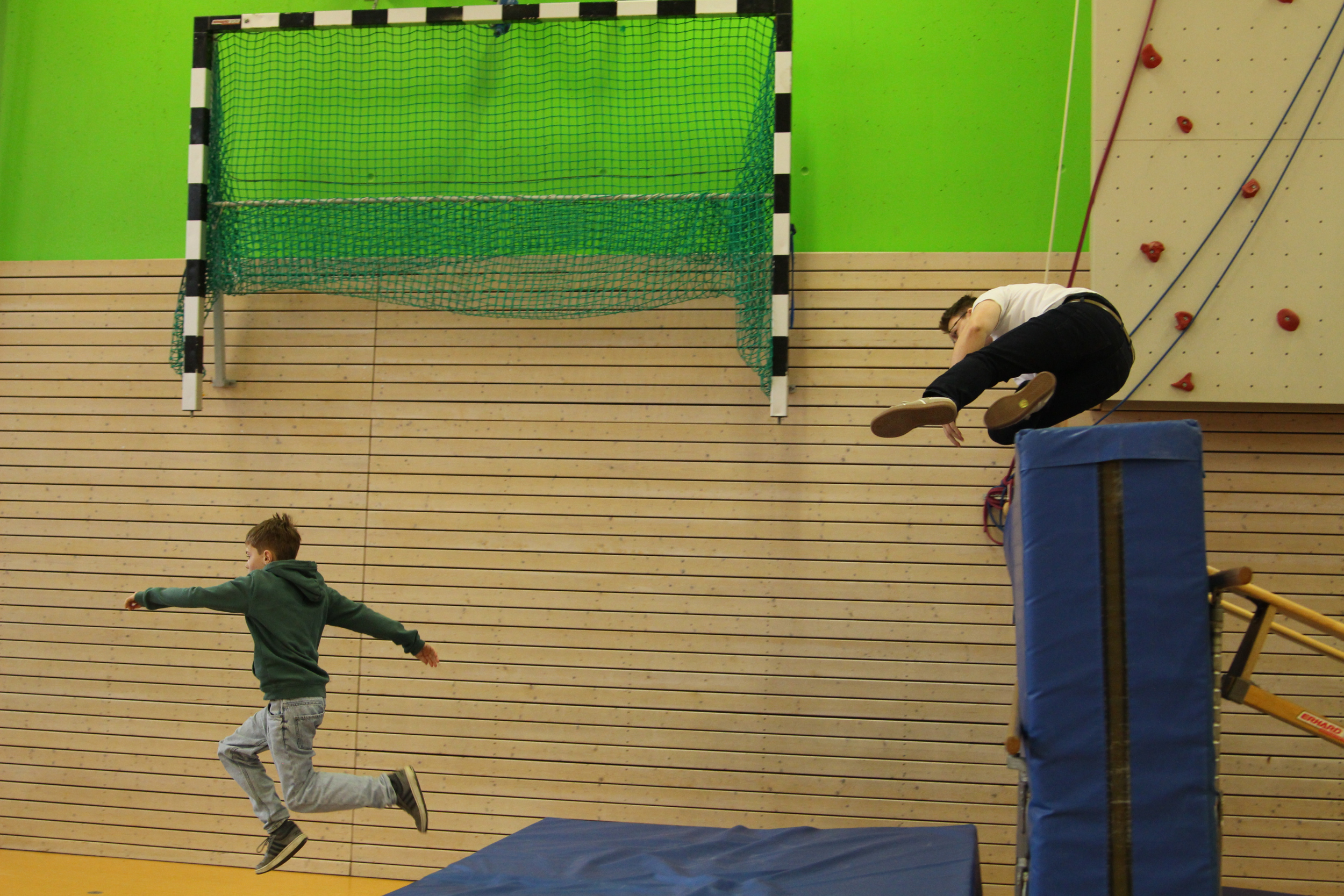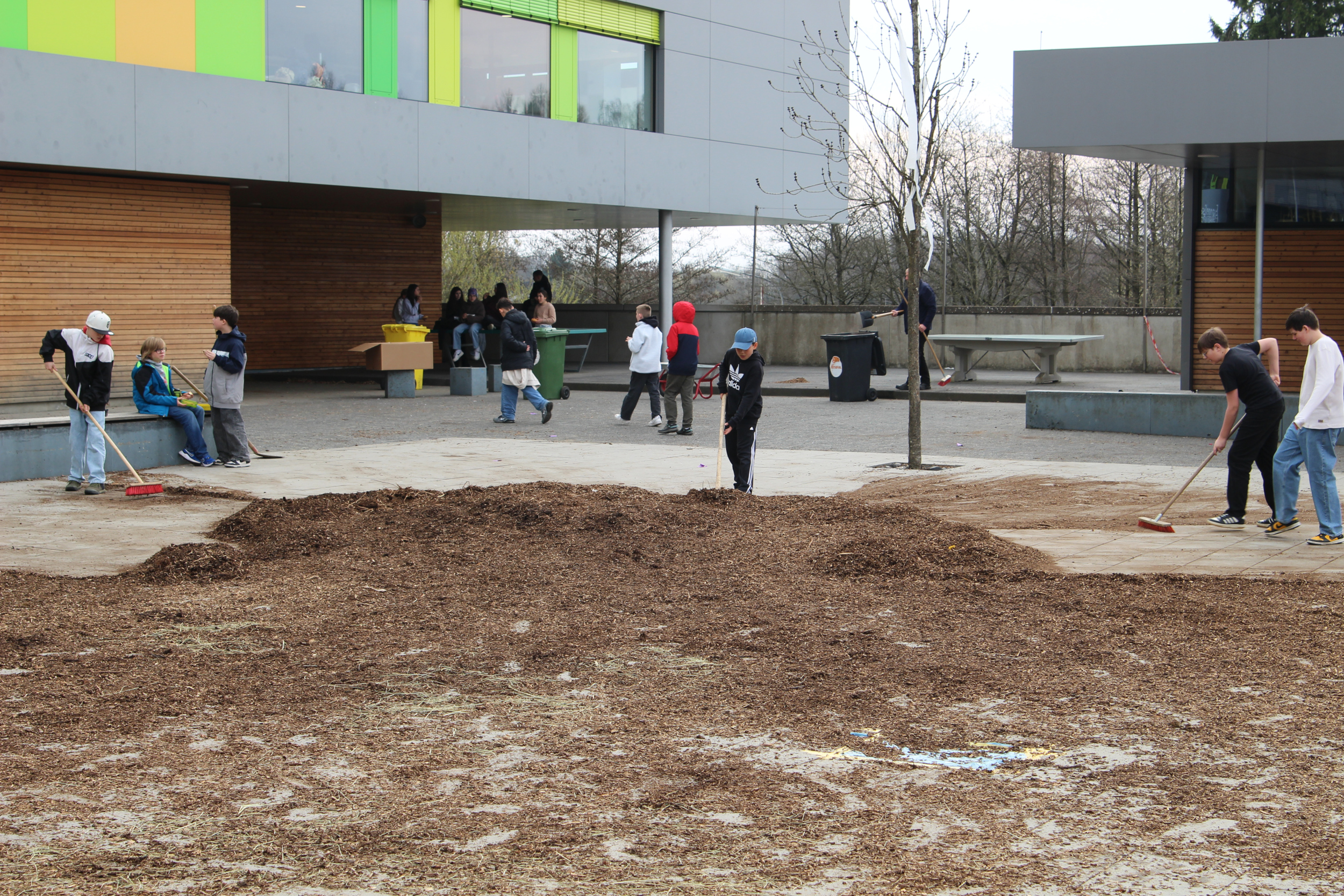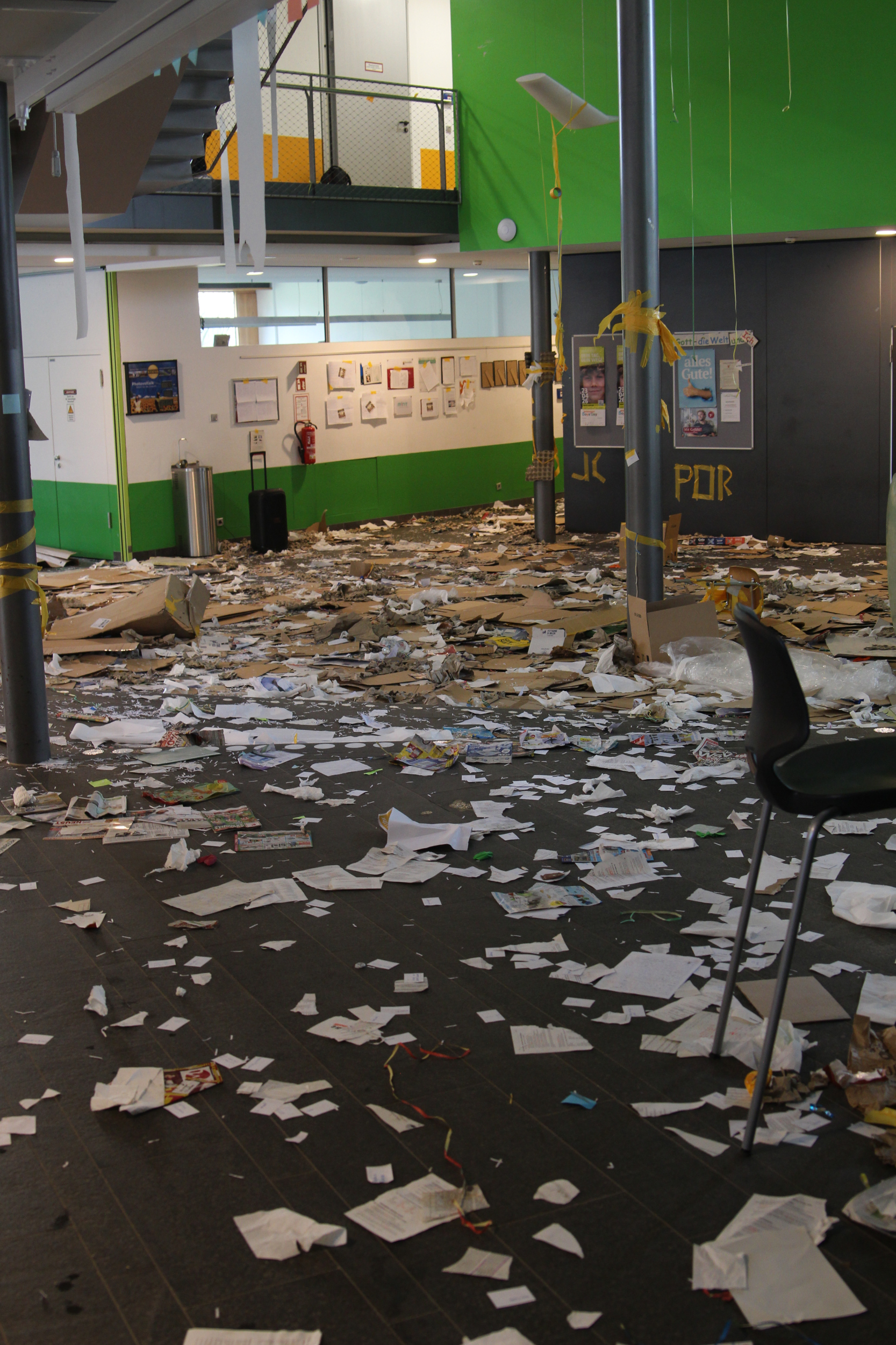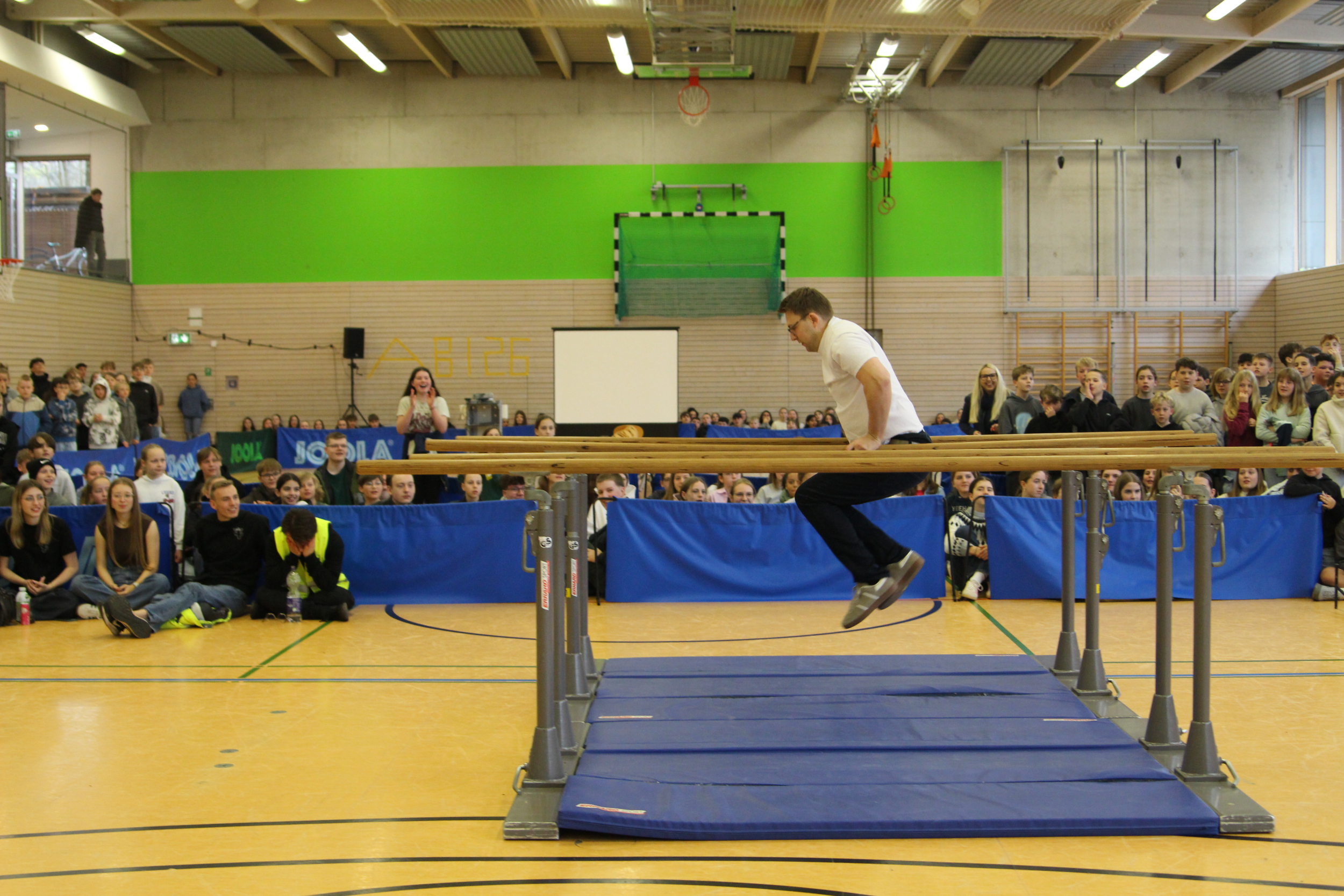 Als am Dienstag, den 24.03.2026, die Lernenden und Lehrenden an das EvGBM kamen, um einen weiteren Tag mit dem fleißigen Erwerben von Kompetenzen und Wissen zu verbringen, erwartete sie eine gehörige Überraschung: Die Schule war abgesperrt; besetzt von dem frischgebackenen Abiturjahrgang 2026. Die Überraschung war groß und groß war auch das Chaos, auf das die Schulgemeinschaft stieß: Der Schulhof war dick mit Rindenmulch bedeckt, die Eingangstür war mit Heuballen versperrt, das Foyer war übersät mit obsolet gewordenen Unterrichtsmitschriften und im grünen Salon wartete das Highlight: ein – nicht mehr ganz verkehrssicherer – Kleinwagen stand im Schulgebäude. Künstlerisch war das Auto zwar „aufgehübscht“ worden, aber die Räder des Boliden fehlten. Um die Hoheit über die Schule (und die Räder für das Auto) zu erlangen, mussten die Lehrenden in der Turnhalle vor der versammelten Schulgemeinschaft in spannenden Wettkämpfen gegen den Abiturjahrgang antreten.