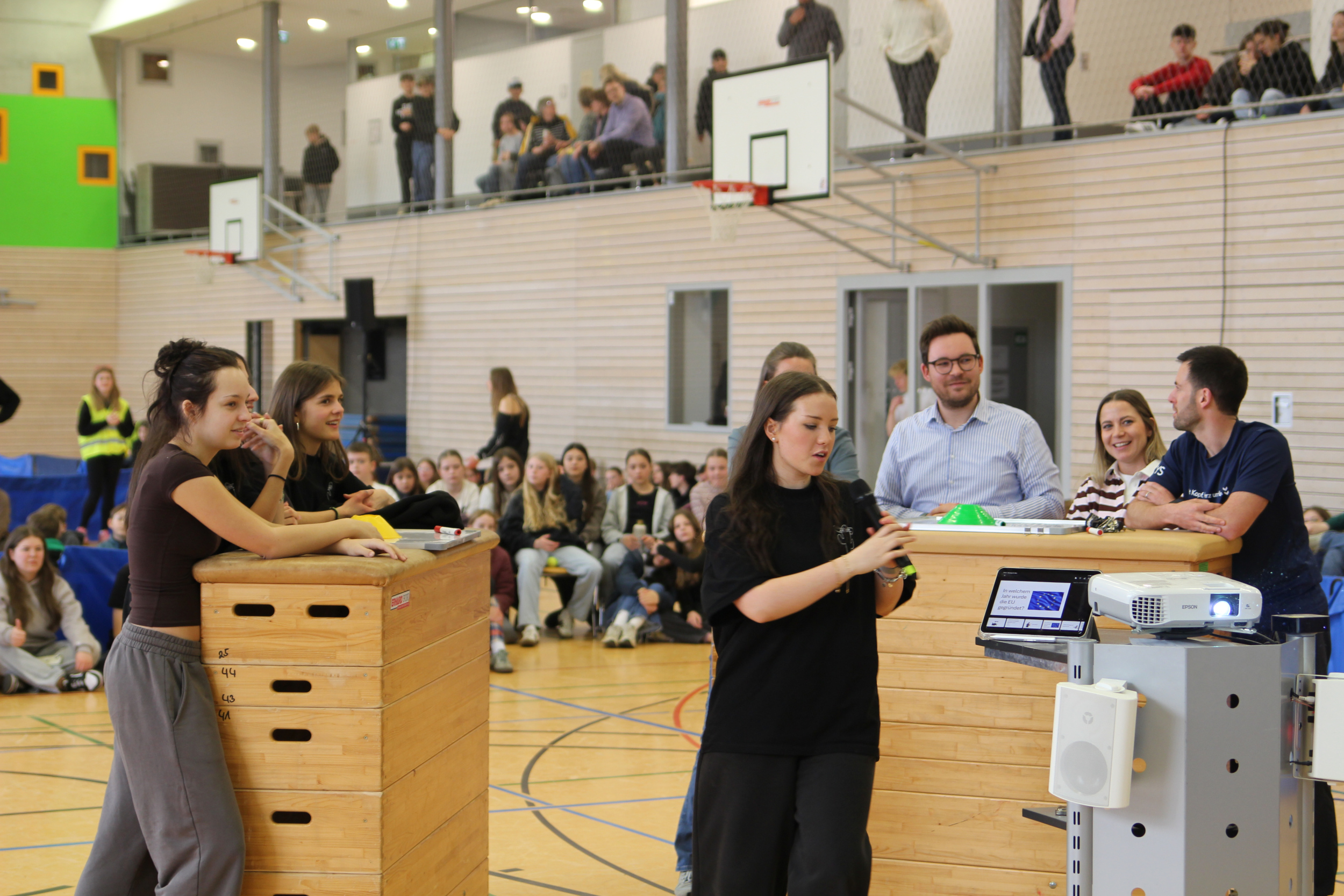 Zwei Quizrunden folgten. Während das Allgemeinwissensquiz unentschieden endete – wobei einige Lösungen lautstark von Seiten der Lehrenden in frage gestellt wurden (Besserwissen ist schließlich der Beruf) – konnten die Schülerinnen im Liederquiz überzeugend gewinnen.