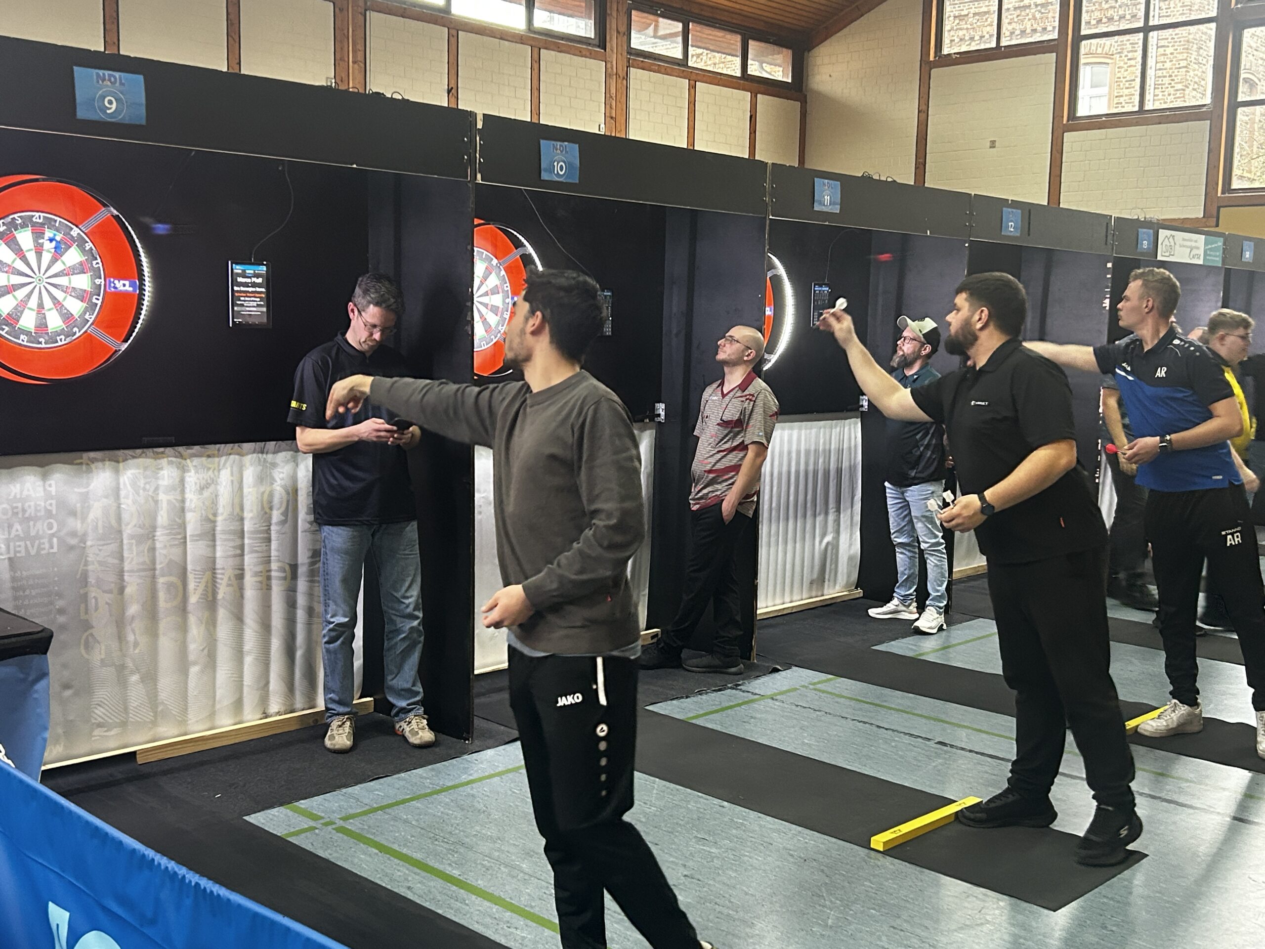 So ging es einen Tag nach Ferienbeginn am Samstag, den 20. Dezember ins rund 70 Kilometer entfernte Breithardt in der Gemeinde Hohenstein im hessischen Taunus. Adrian, Dennis, Bennett und Erik wurden dabei von Herrn Meier und Herrn Lühr begleitet. Am Turnierort angekommen wartete eine Halle mit 16 professionell hergerichteten Boards sowie eine große Bühne mit einem weiteren Board. In der Gruppenphase ging es Schlag auf Schlag. Adrian musste sein erstes Gruppenspiel direkt unter den Blicken der vielen Zuschauer auf der Bühne austragen – eine gang besondere Herausforderung!