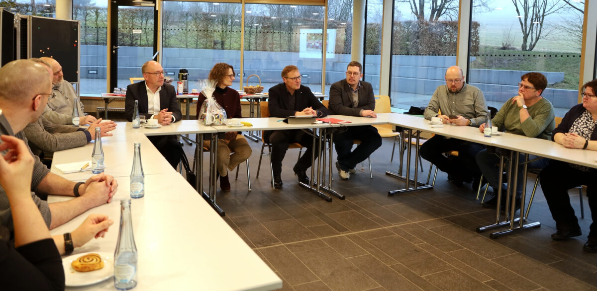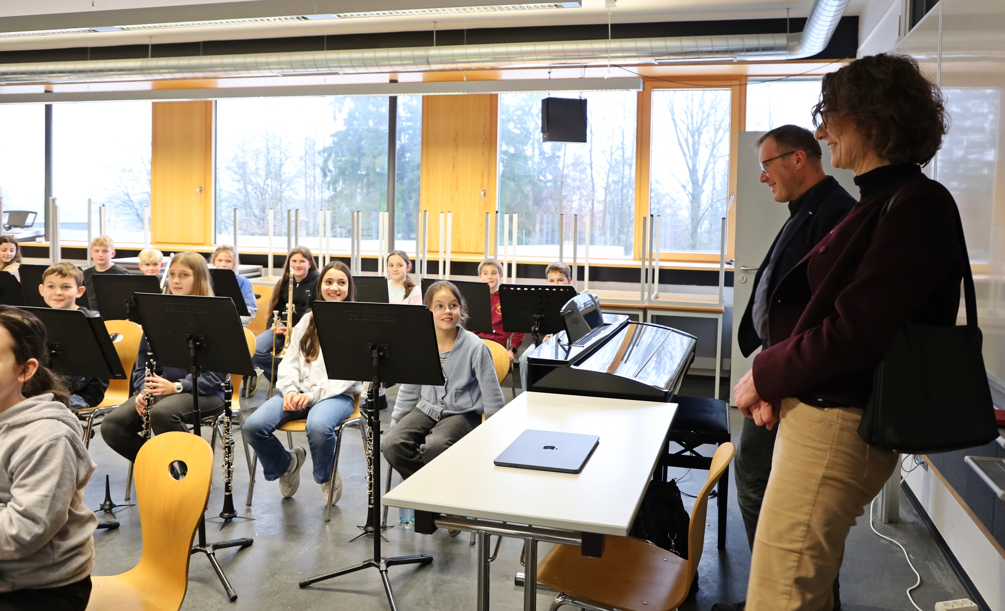 Dr. Tietz zeigte sich besonders interessiert am Konzept der Ganztagsschule, die nachmittags sowohl Förderunterricht als auch sportliche, musikalische und kreative Programme anbietet. In einem ausgeklügelten Stundenplan können Schülerinnen und Schüler oft spontan entscheiden, welche Art von Angebot sie an den Nachmittagen brauchen werden. Besondere Erfolge feiert das Gymnasium mit seinen Gruppen in den Bereichen technische Entwicklung und Forschung sowie musikalischen Projekten. Ein Besuch in der AG der Bläserklasse mit rund dreißig jungen Musikerinnen und Musikern machte sichtlich Eindruck auf die Kirchenpräsidentin.