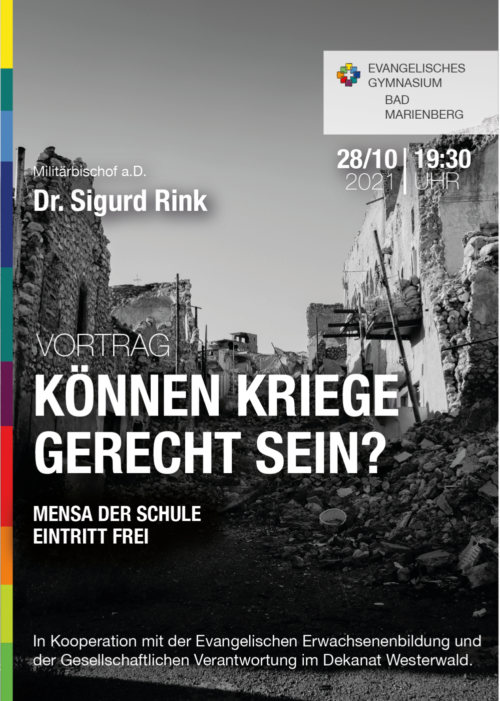 Wir freuen uns, Sie in Kooperation mit der Evangelischen Erwachsenenbildung und der Gesellschaftlichen Verantwortung im Dekanat Westerwald am 28.10.2021 um 19.30 Uhr in der Schulmensa zum Vortrag von Militärbischof a.D. Dr. Sigurd Rink zu der Frage „Können Kriege gerecht sein?“ einladen zu dürfen.