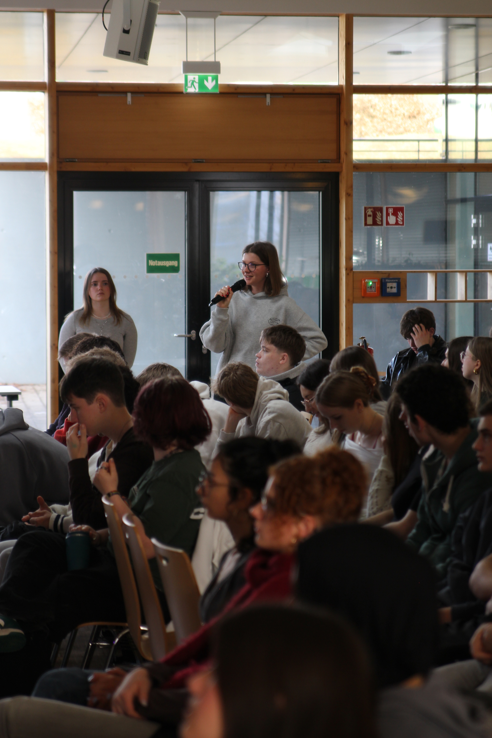Als Teilnehmende waren die komplette MSS 13, die zur Gruppe der Erstwählerinnen und Erstwähler gehört, sowie die Leistungskurse Sozialkunde der MSS 11 und 12 anwesend. Die Veranstaltung wurde bewusst von Schülerinnen selbst moderiert: Emma Lucke und Eva Schulte führten souverän durch die Diskussion und sorgten dafür, dass neben globalen und nationalen Fragestellungen immer wieder der Fokus auf landespolitische Themen gelegt wurde.