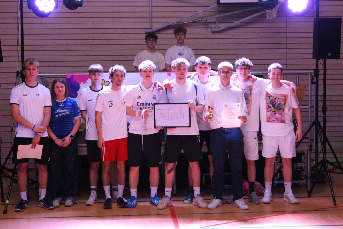 Die beiden Favoriten trafen schließlich im Halbfinale aufeinander und nach zwei Sätzen stand fest, dass sich die Erfahrung und Ruhe der “Zerschmetterer” dem jugendlicher Elan der “glorreichen 5 (und Rafael) geschlagen geben mussten. Während die “glorreichen 5 (und Rafael)” ins Finale einzogen und das Turnier gewannen, konnten die Mannschaft der Lehrerinnen und Lehrer noch Ehrenrettung betreiben und sich Platz 3 sichern. Die Mannschaft “FC Tisch” (zusammengesetzt aus Schülern der Sport-LKs der MSS 11 & MSS 12) entschied das zweite Halbfinale für sich und errang Platz 2 des Turniers.