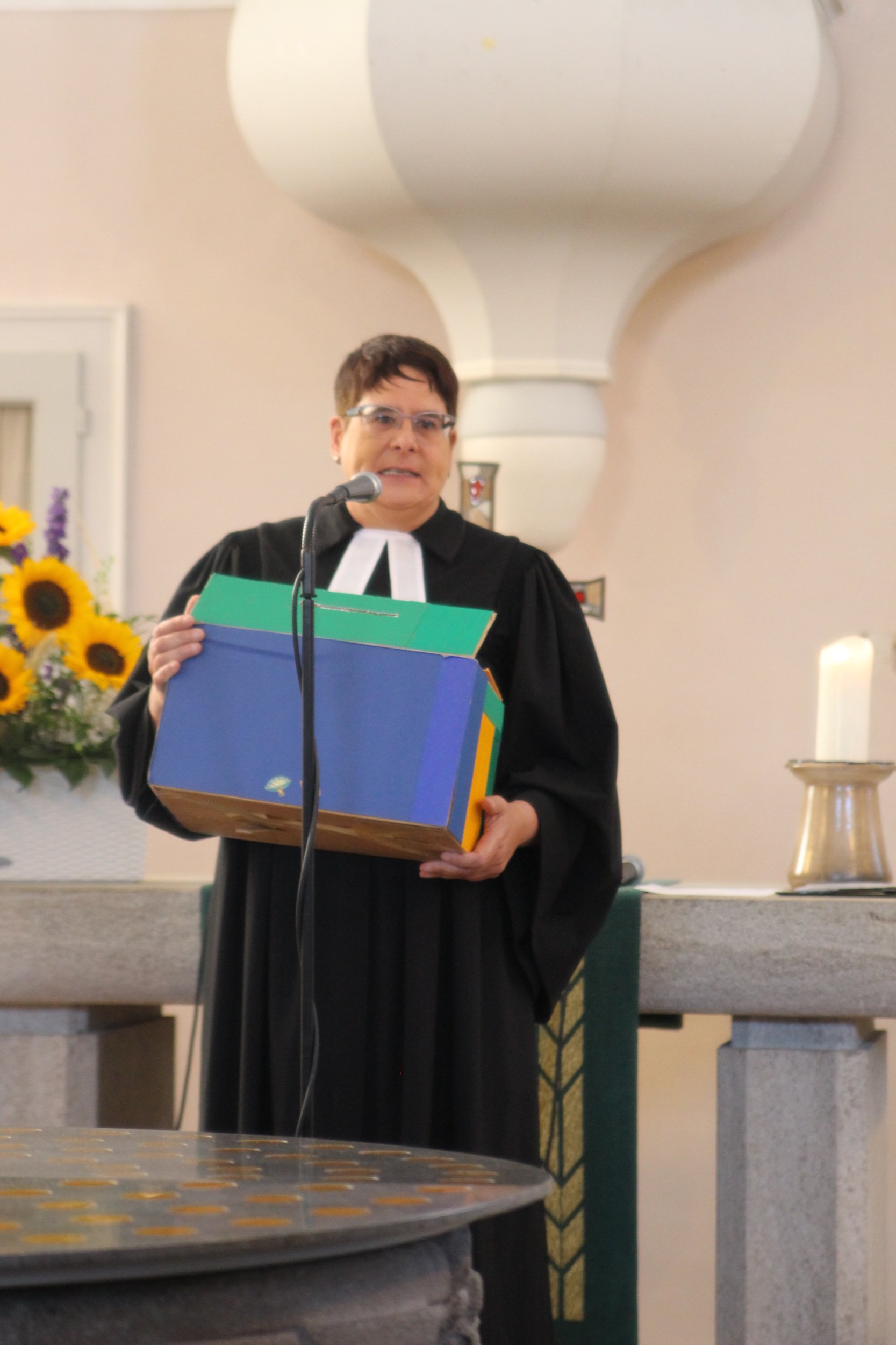 Nach den Reden überreichte Janne Neumann, von der Evangelische Schulstiftung in der EKD, der Schulleitung noch ein persönliches Geschenk zum Jubiläum. Vor allem im Bereich der Inklusion können das EvGBM und die ESS EKD auf eine tragfähige Zusammenarbeit zurückblicken. So wurden zum Beispiel die Einrichtung eines Inklusionsraums und die Sanierung eines Klassenraums für Hörbeeinträchtigte Personen durch die Unterstützung durch die Evangelische Schulstiftung möglich. Dank für die vielfältige Unterstützung in den vergangenen Jahren darf auch herzlich an die Barbara-Schadeberg-Stiftung (vertreten durch die geschäftsführende Vorständin Sabine Ulrich) entsendet werden, die das EvGBM beispielsweise in seinem Engagement für Demokratieprojekte unterstützt hat und die Schulfahrt fördert.