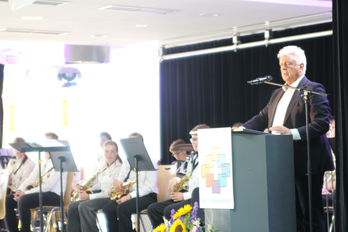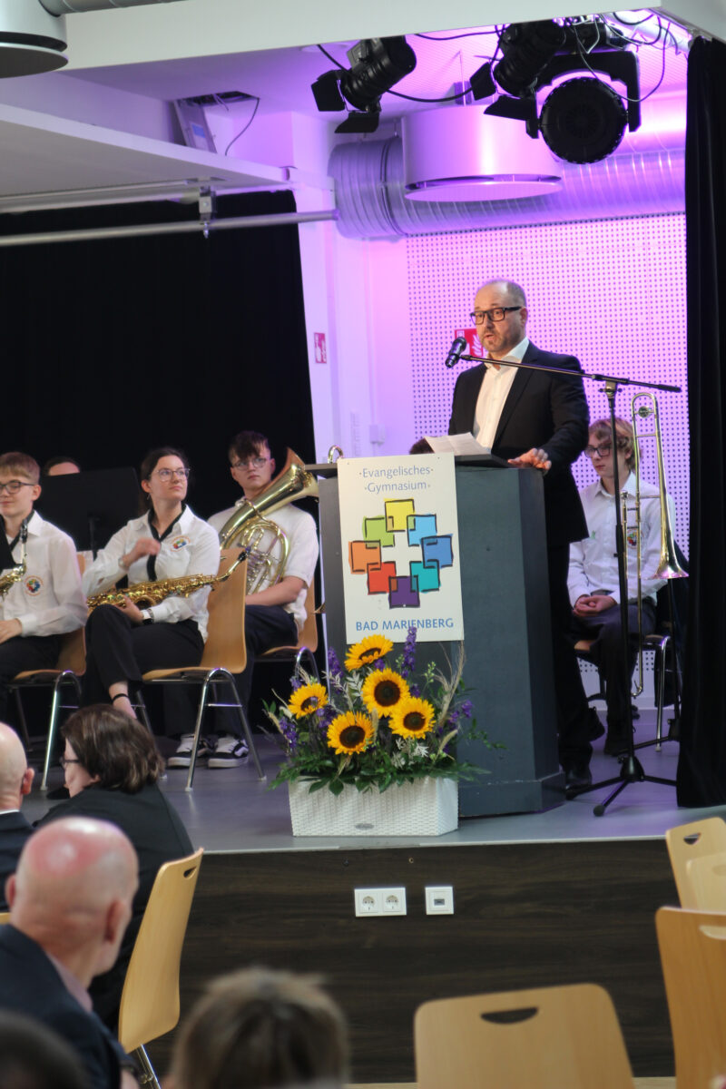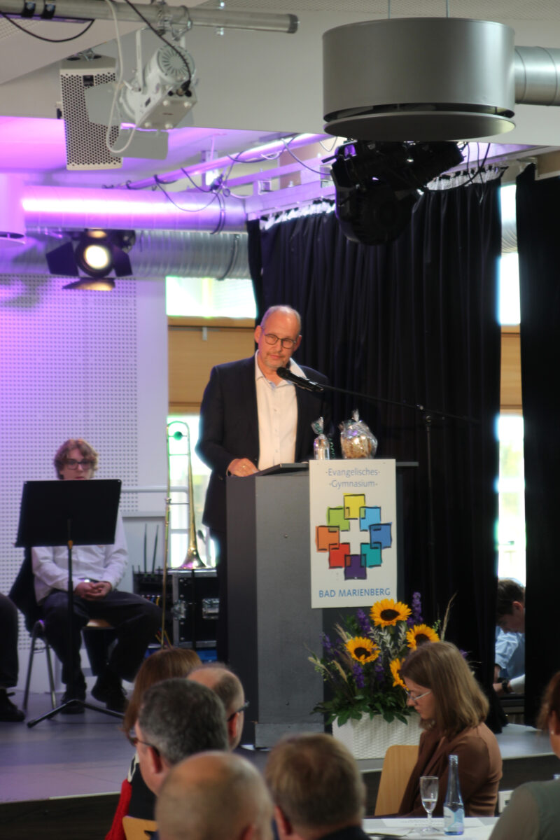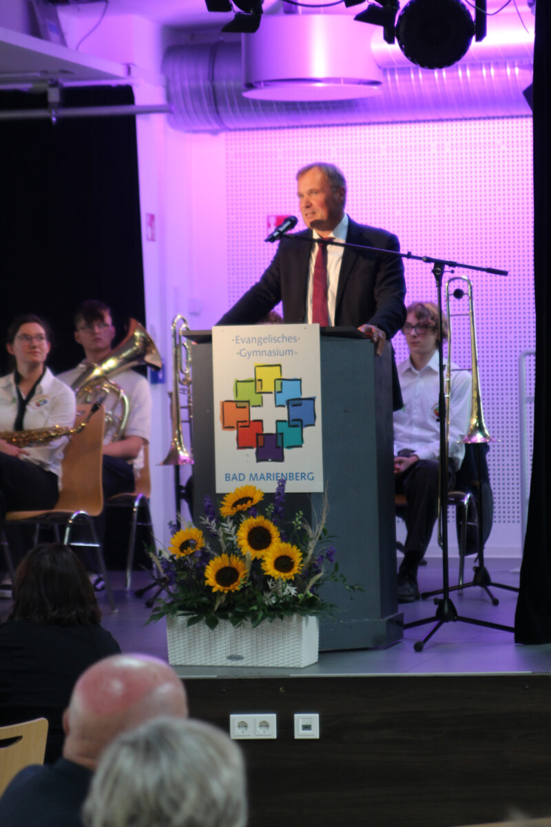Landtagspräsident Hendrik Hering schloss sich als Redner an und blickte auf die „segensreiche Entscheidung“ zurück, die vor 20 Jahren die Gründung des EvGBM ermöglichte, die Schullandschaft im Westerwald maßgeblich bereichert hat und den Schülerinnen und Schülern der Region seitdem große Chancen ermöglicht. Hering lobte vor allem die wertebasierte Bildung am EvGBM, welche die Schule allzu oft zum Vorbild für die Schulen des Landes macht und einen wichtigen Beitrag zum Erhalt unserer freitheitlich-demokratischen Grundordnung liefert.