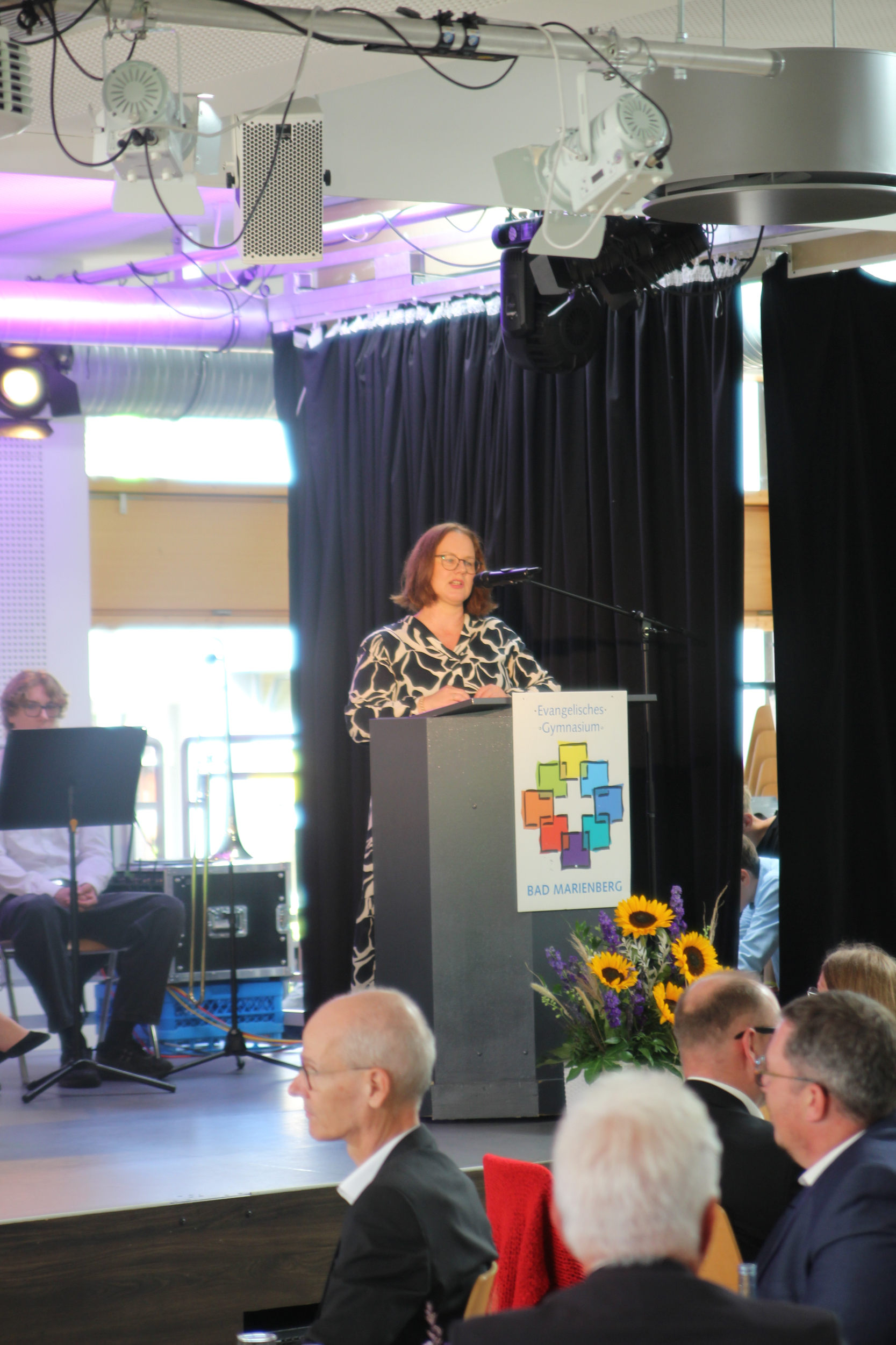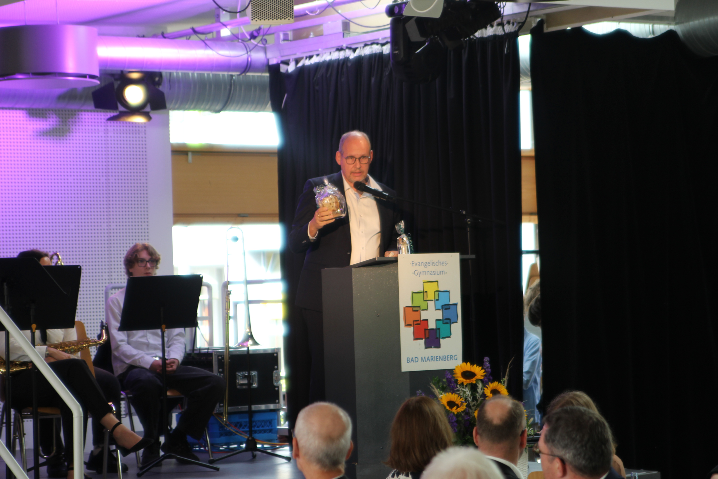 Dort erinnerte zunächst Kirchenrat Sönke Krützfeld an die Gründung der Schule vor 20 Jahren und an die Werte, auf dem das ev. Gymnasium Bad Marienberg seither ruht: Einen Lernort zu schaffen, an dem man nicht nur Wissen vermittelt wird, sondern man sich auch wohlfühlt. Krützfeld lobte in diesem Zusammenhang auch die Entscheidung des Bildungsministers Sven Teuber, unangekündigte Leistungsüberprüfungen zu verbieten, denn – so Krützfeld – „Druck lässt keine Diamanten entstehen, sondern Menschen zerbrechen.“