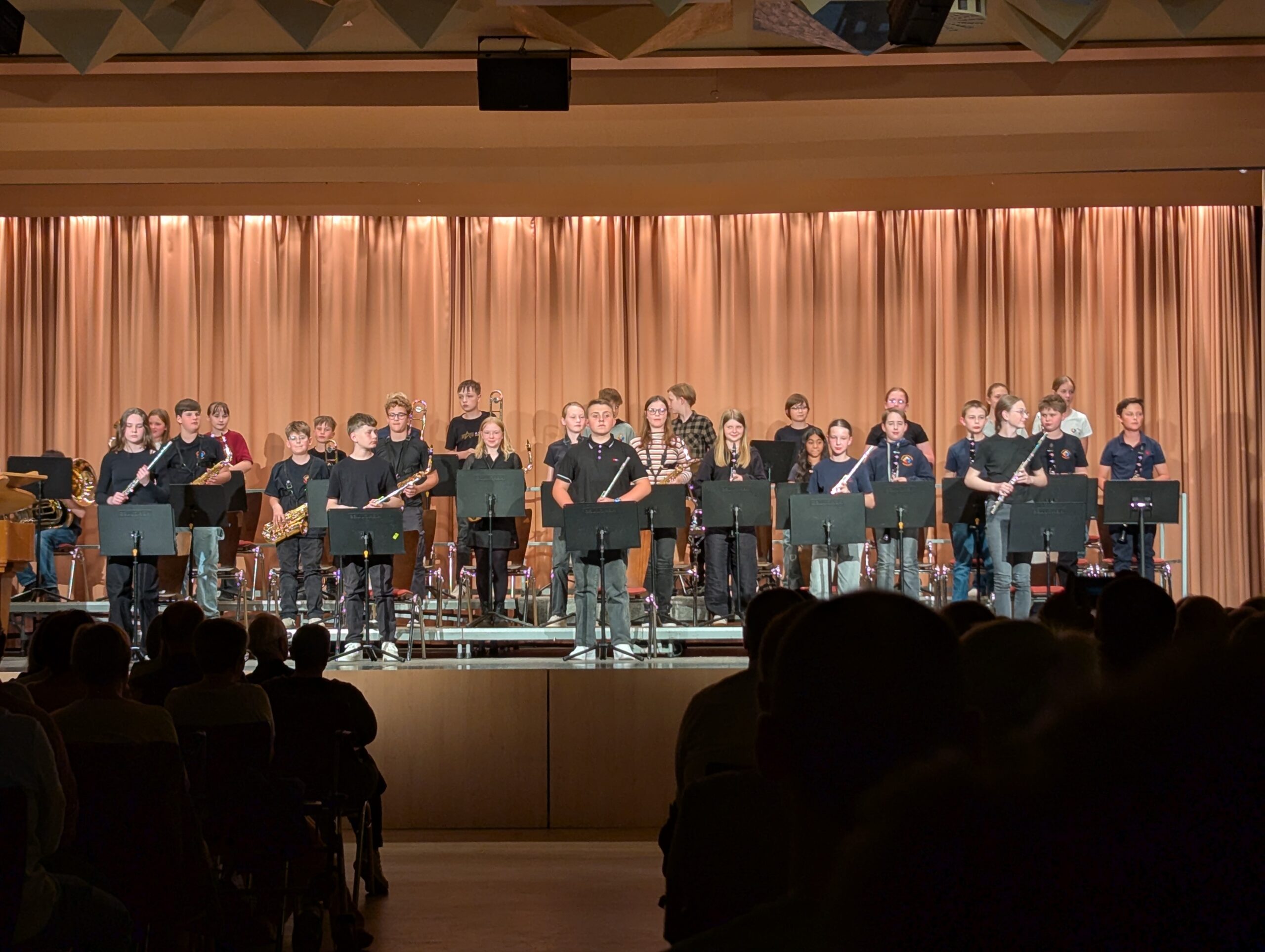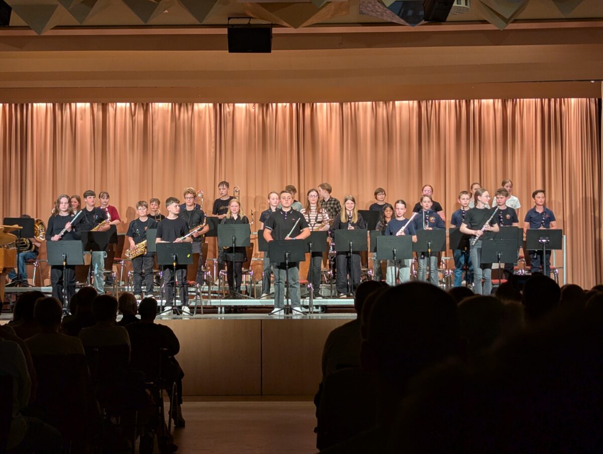 Die Show hatte für alle Geschmäcker etwas in petto. Nach einer kurzen Begrüßung durch die Schulleitung ließen es Marco Jeuck und seine Bläserklassen der Klassenstufen 5 & 6 krachen: Von traditionellen Songs wie „When The Saints Go Marching In“ oder „Yesterday“ von John Lennon, über klassische Musik von Beethoven („Ode an die Freude“), bis zu Rock („Rock-A-Saurus-Rex!“) und sogar Filmmusik („Pirates Of The Caribbean“) war die Liedauswahl sehr bunt und stellte die Bandbreite der jungen Musiker unter Beweis.