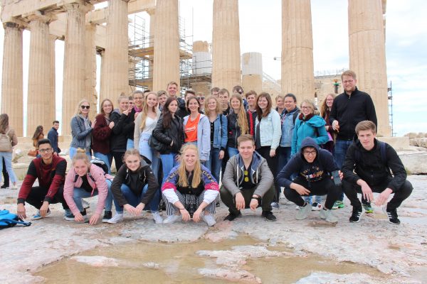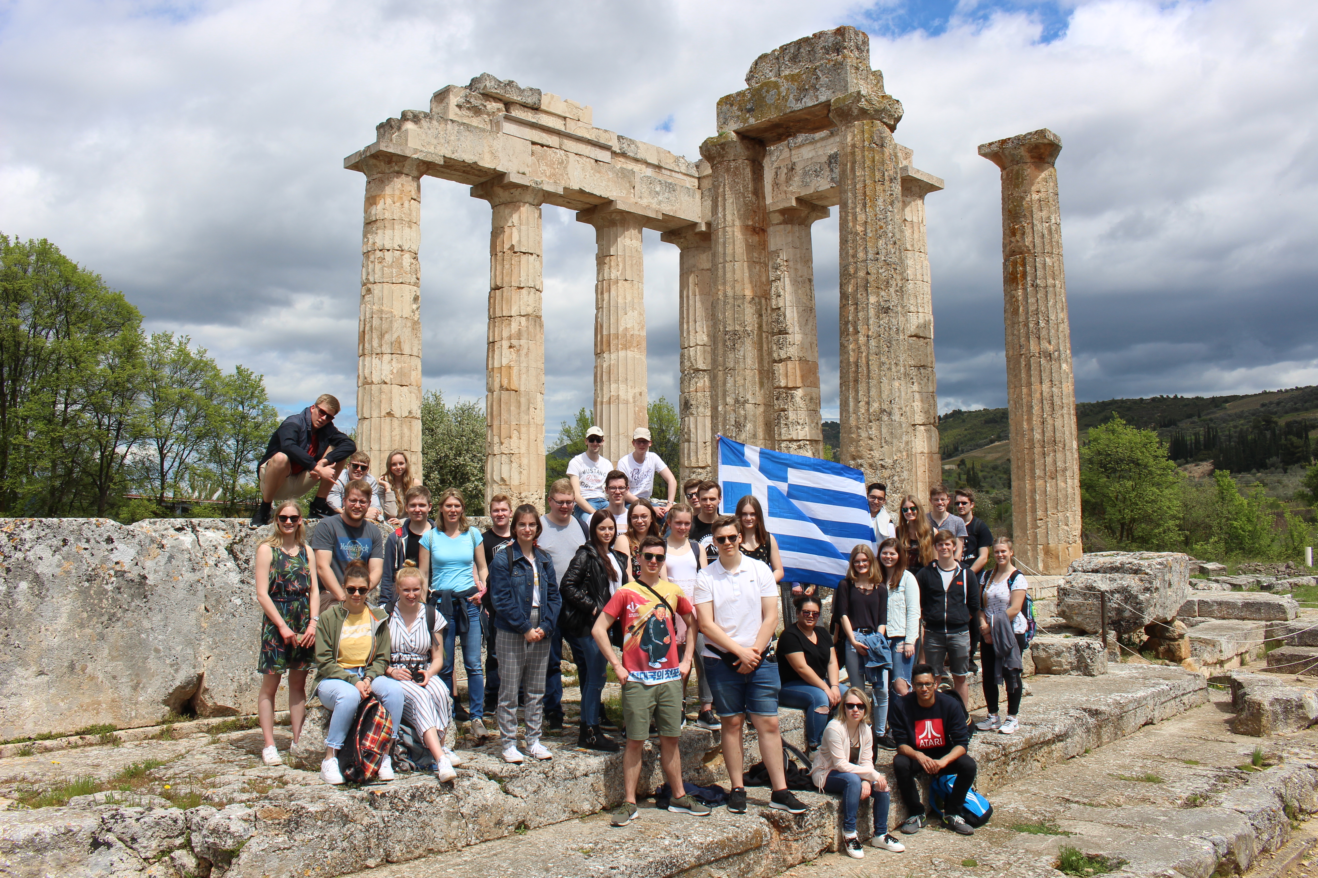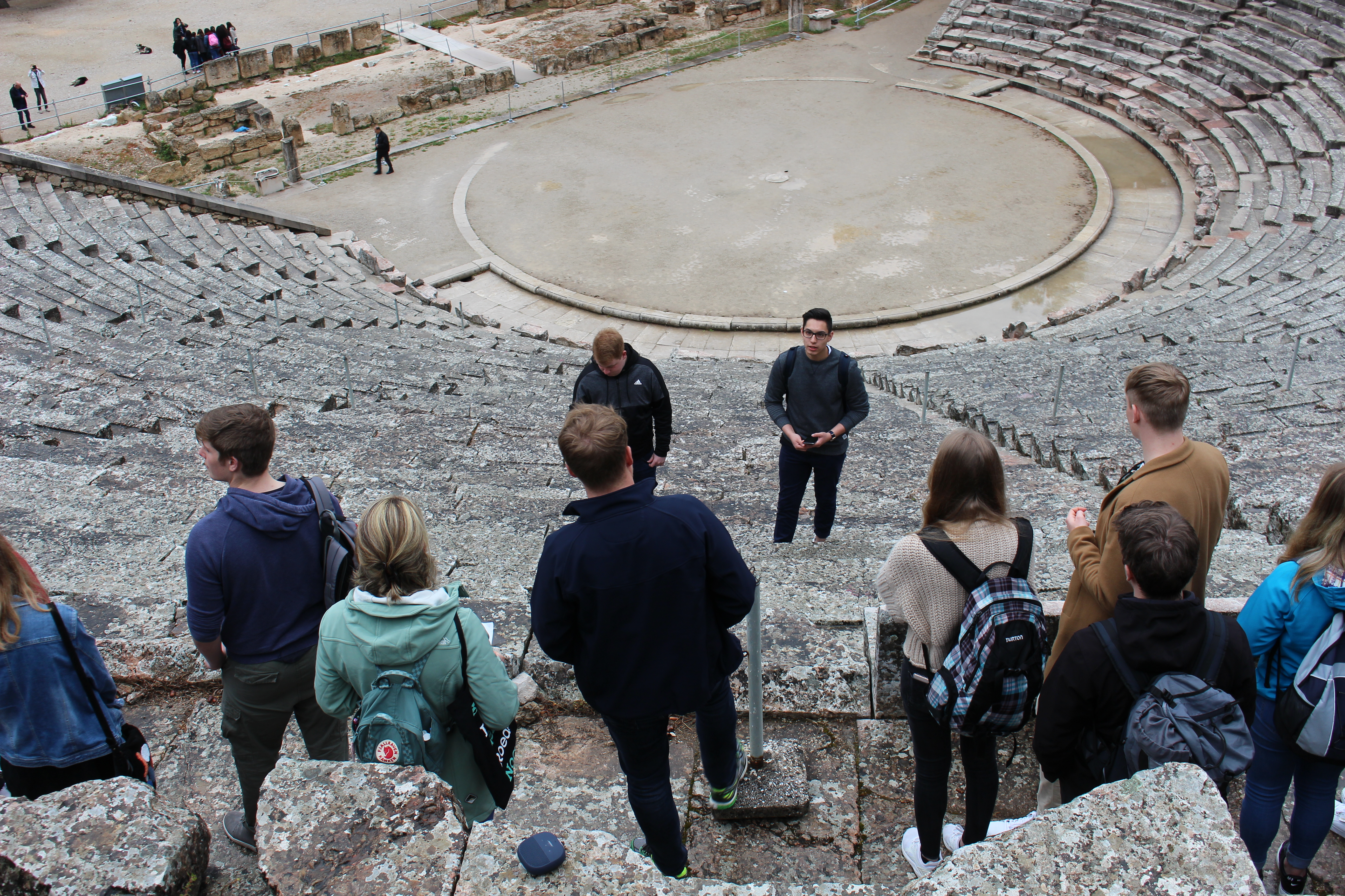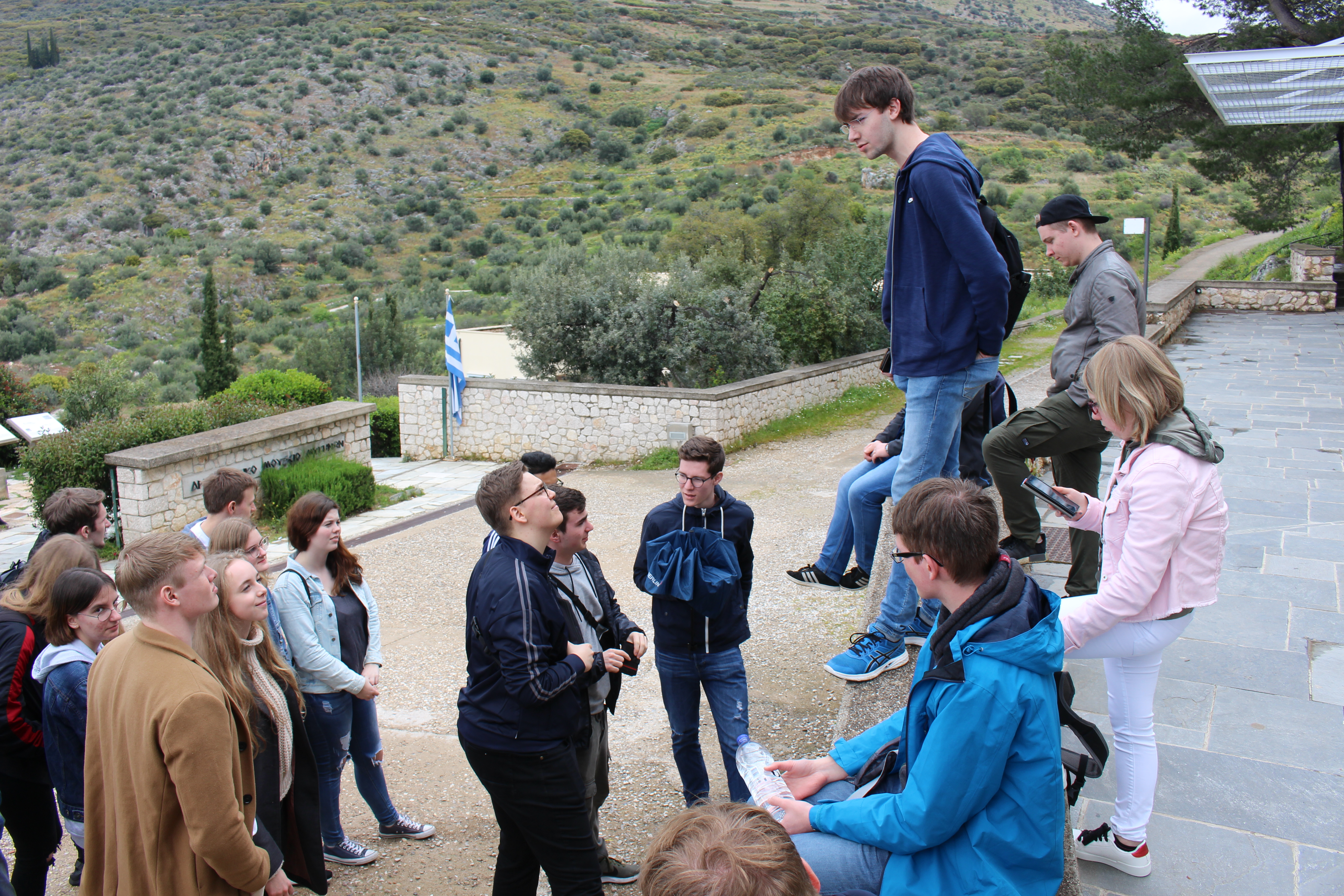 Früh starteten wir nach Athen. Auf dem Weg lag der berühmte Kanal von Korinth, der von oben betrachtet wie eine schmale, tiefe Schlucht wirkte. In Athen bereitete uns Miriam als Museumsführerin auf den Besuch der Akropolis vor, indem sie uns die Gebäude und Mythen rund um die Akropolis erklärte. Was sie offensichtlich nicht wußte: Das Fotografieren mit der griechischen Flagge ist verboten und wird streng, unnachgiebig und rigoros umgesetzt, damit das Wahrzeichen der Stadt und des Staates Griechenland nicht für politische Propaganda missbraucht wird. Unserem Schulleiter Herrn Weigand wurde das fast zum Verhängnis, als er ein Foto unserer Gruppe mit griechischer Flagge machen wollte. Zum Glück konnte durch das Löschen der Bilder der Zorn der Aufsichtsgötter beruhigt werden.