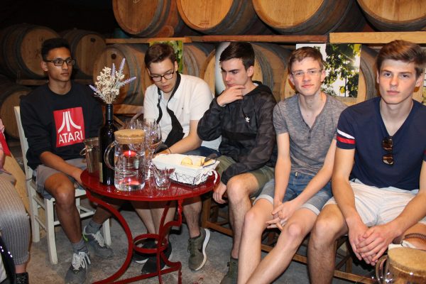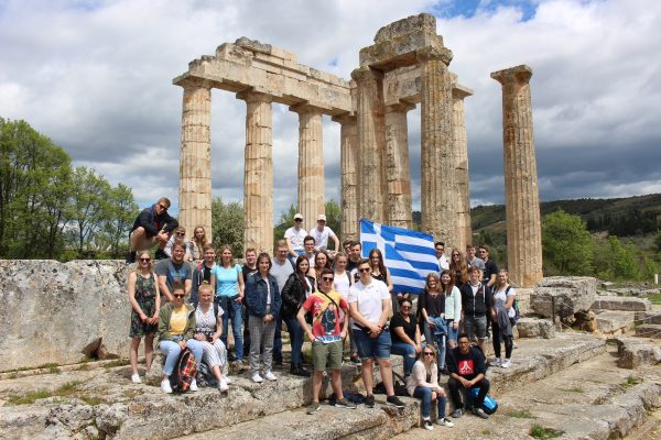 Die neue Ausgrabungsstätte Nemea liegt eingebettet in einer bezaubernden bukolischen Landschaft; sehr gut erhalten ist der Zeustempel und das Stadion der nemetischen Spiele. In den Gewölben zur Arena sind noch die Graffiti der Athleten zu sehen. Nachdem Herr Guhl uns den Mythos um rund um den nemeischen König Lykurgos erläuterte, genossen wir die Zeit in der verträumten ruhigen Ausgrabungsstätte. Dort trauten wir uns auch noch, ein Foto mit griechischer Fahne zu machen. Bei den internen numerischen Spielen siegte in der Kategorie Heroen Herr Diehl im Sprint knapp vor Herrn Weigand und der „Reitergruppe“ der Schüler. Andere Beobachter sprachen allerdings von einer Deklassierung unseres Schulleiters, der das Zielfoto leider zensierte. Herr Guhl spürte es wohl, dass man auch von antiken Steinen mal etwas Abstand braucht und organisierte spontan eine Weinprobe – Jammas!