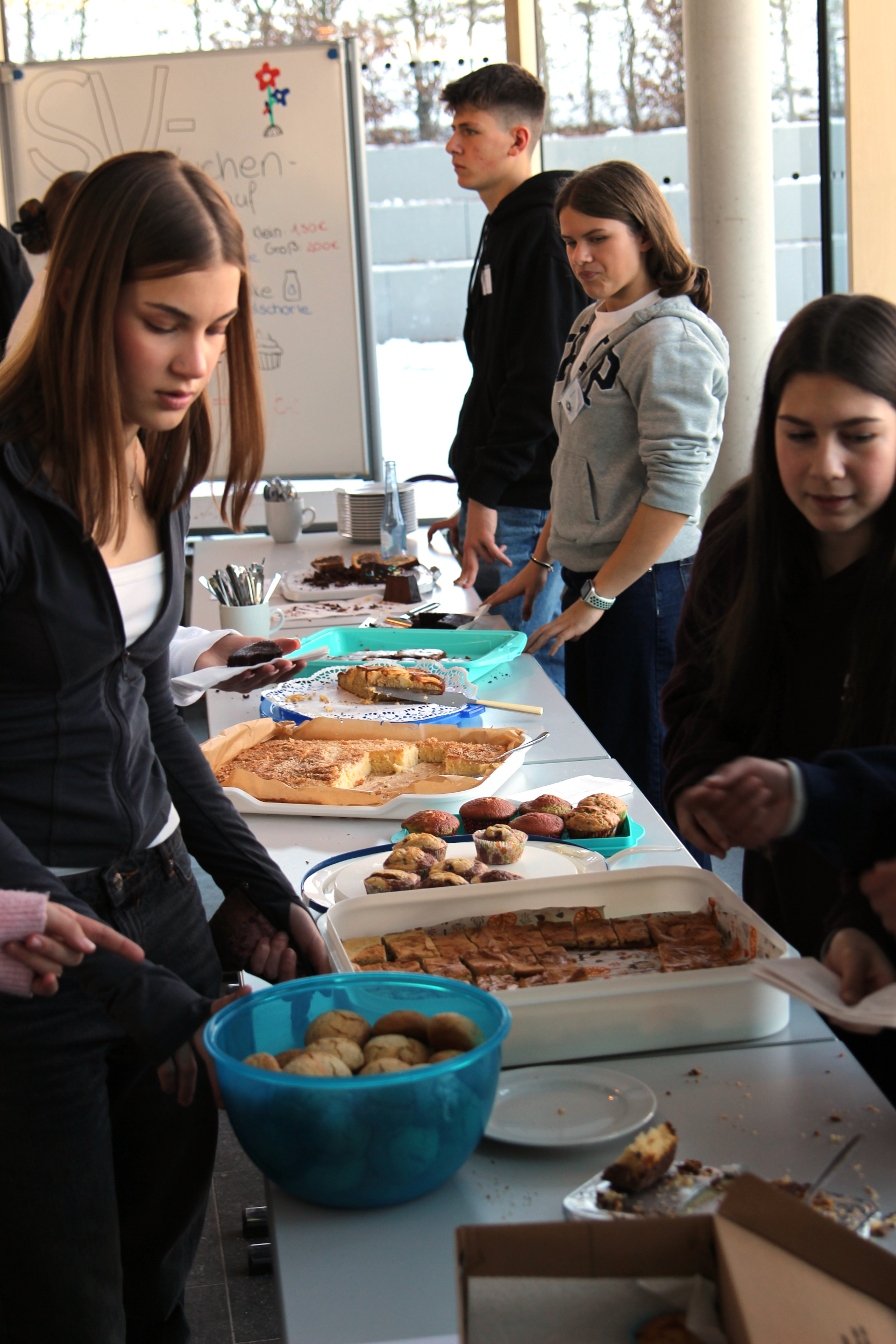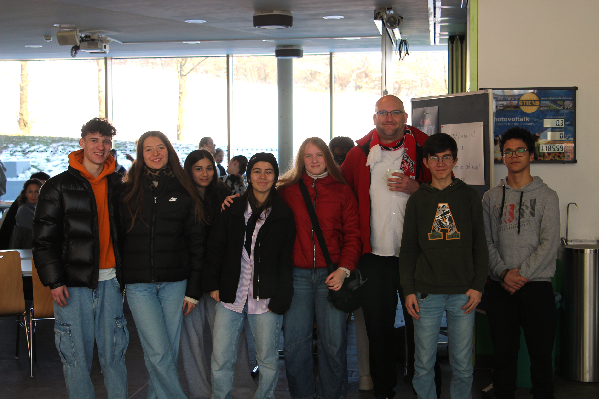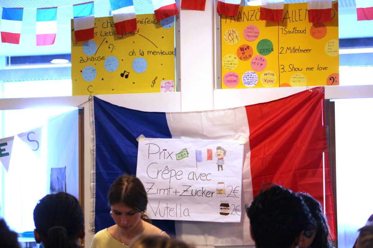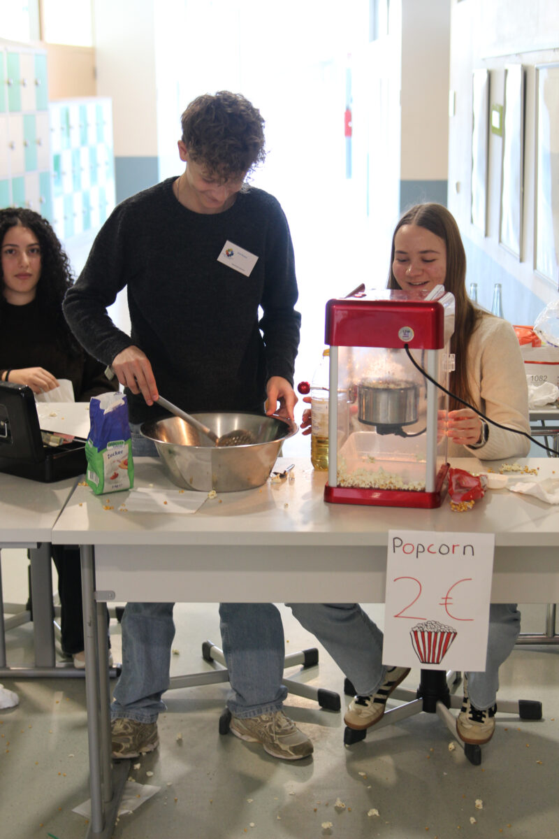 Im Foyer warteten Infostände der Schulleitung, des Fördervereins und des Schulelternbeirats, der Schulsanitätsdienst präsentierte seine Arbeit und der Fachbereich Kunst verkaufte selbstgemachte Seife und Weihnachtskarten. Außerdem bot die Schülervertretung selbstgemachte Kuchen an und die Fachschaft Französisch backte Crêpes.
