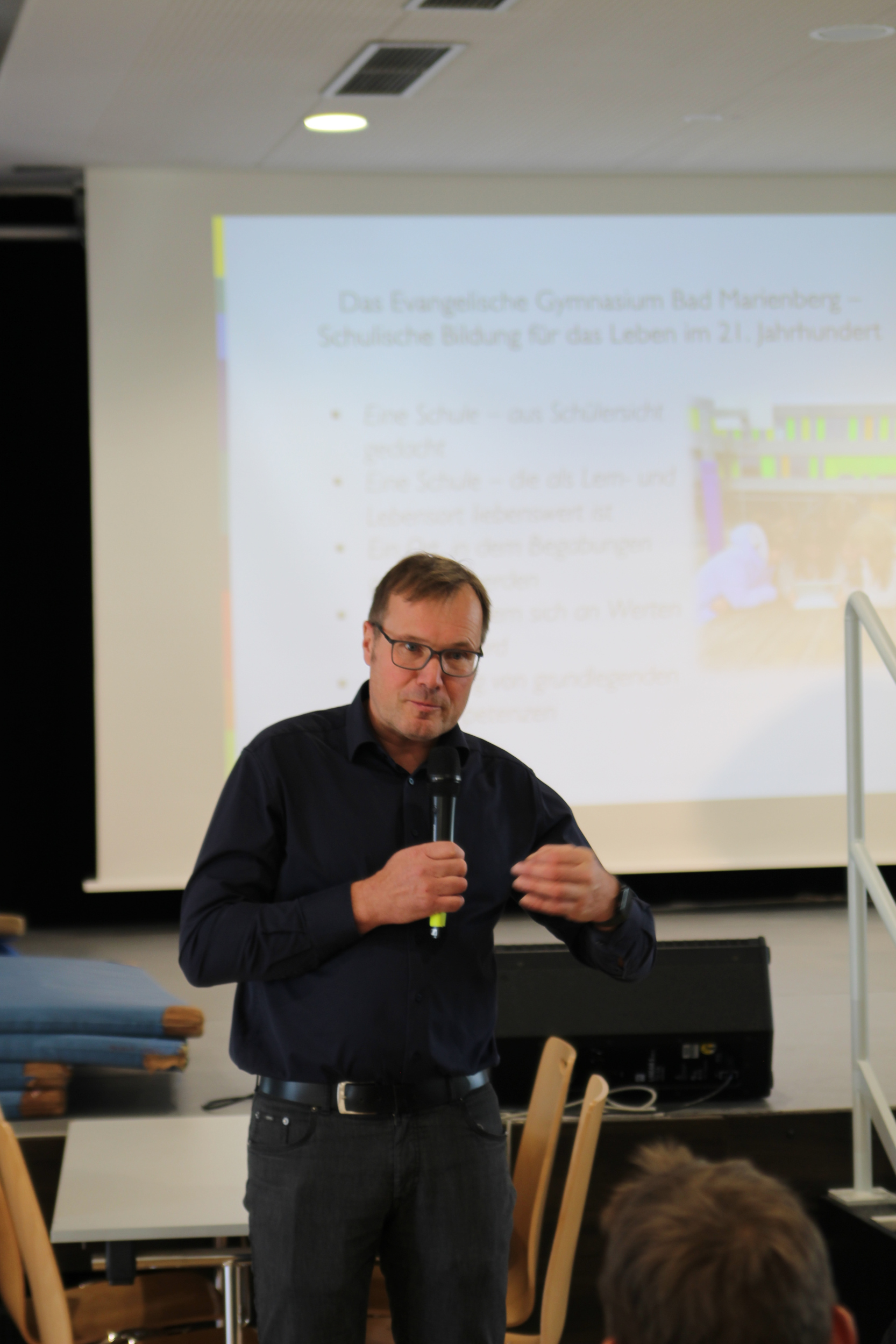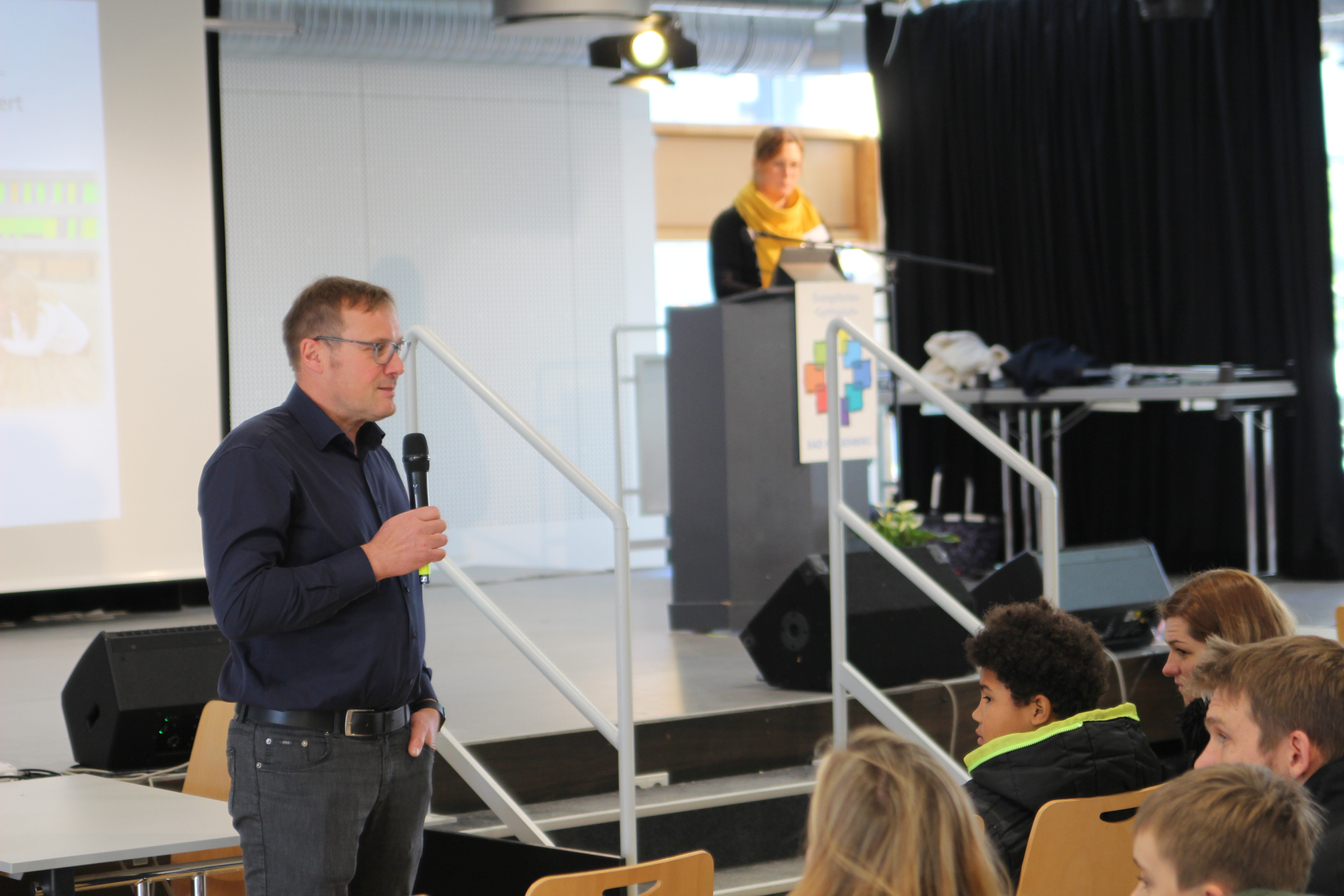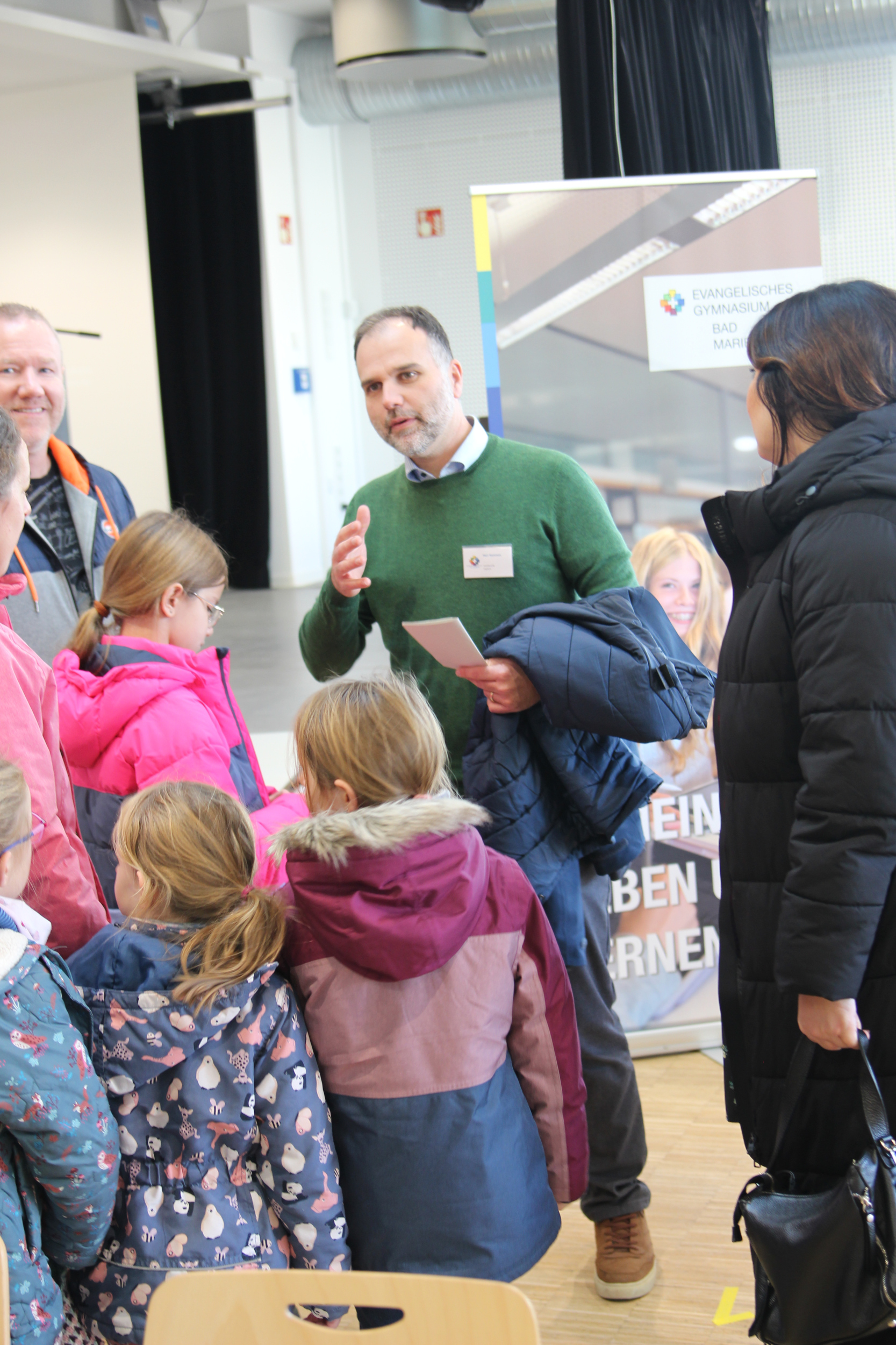 Begrüßt wurden die interessierten zukünftigen Schülerinnen und Schüler – mitsamt ihrer Eltern und Begleitungen – in der Mensa durch Schulleiter Dirk Weigand und Orientierungsstufenleiterin Silvia Gruner-Menk. Von der Mensa aus wurden die Besucher verschiedenen Führungen zugeteilt, die dann während eines umfangreichen Rundgangs allerlei Wissenswertes und Interessantes zum EvGBM präsentierten.