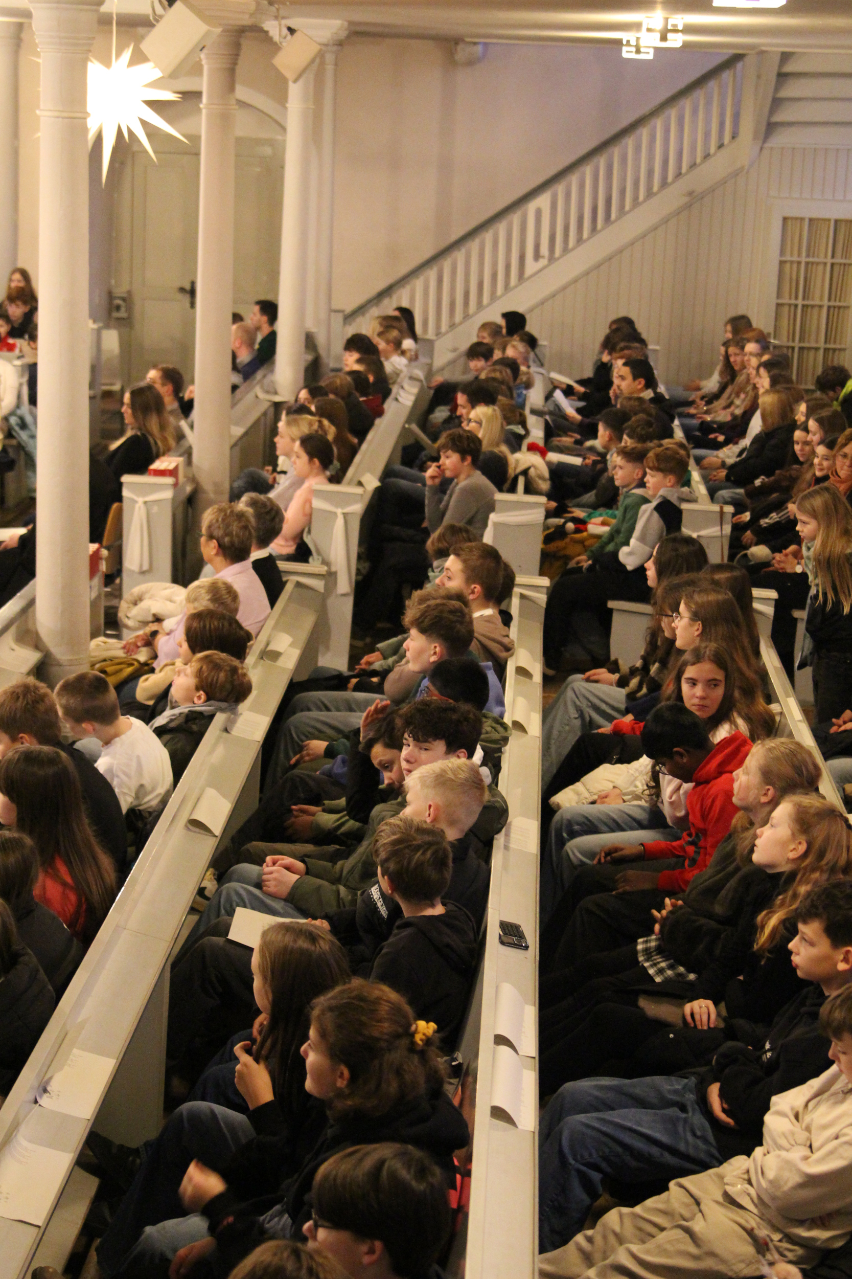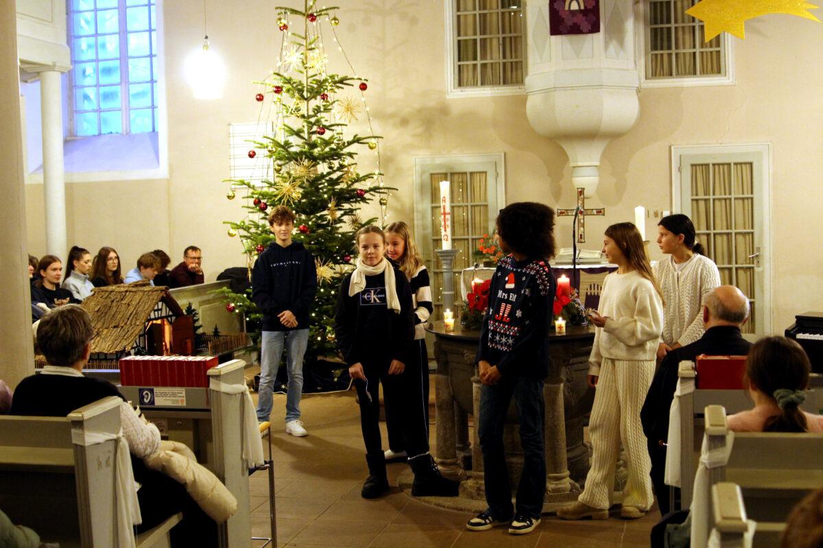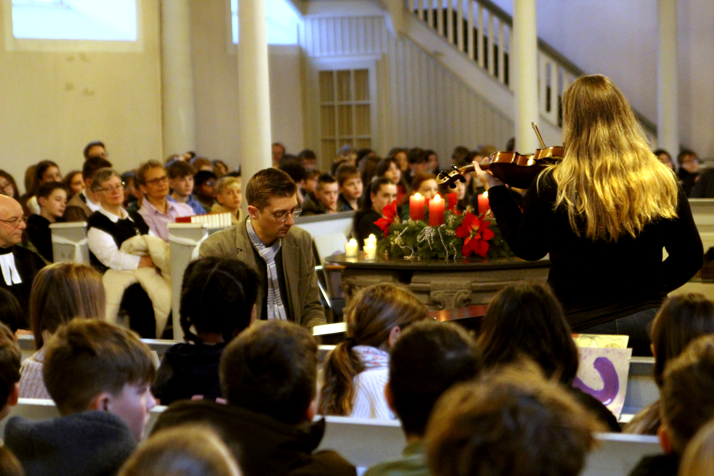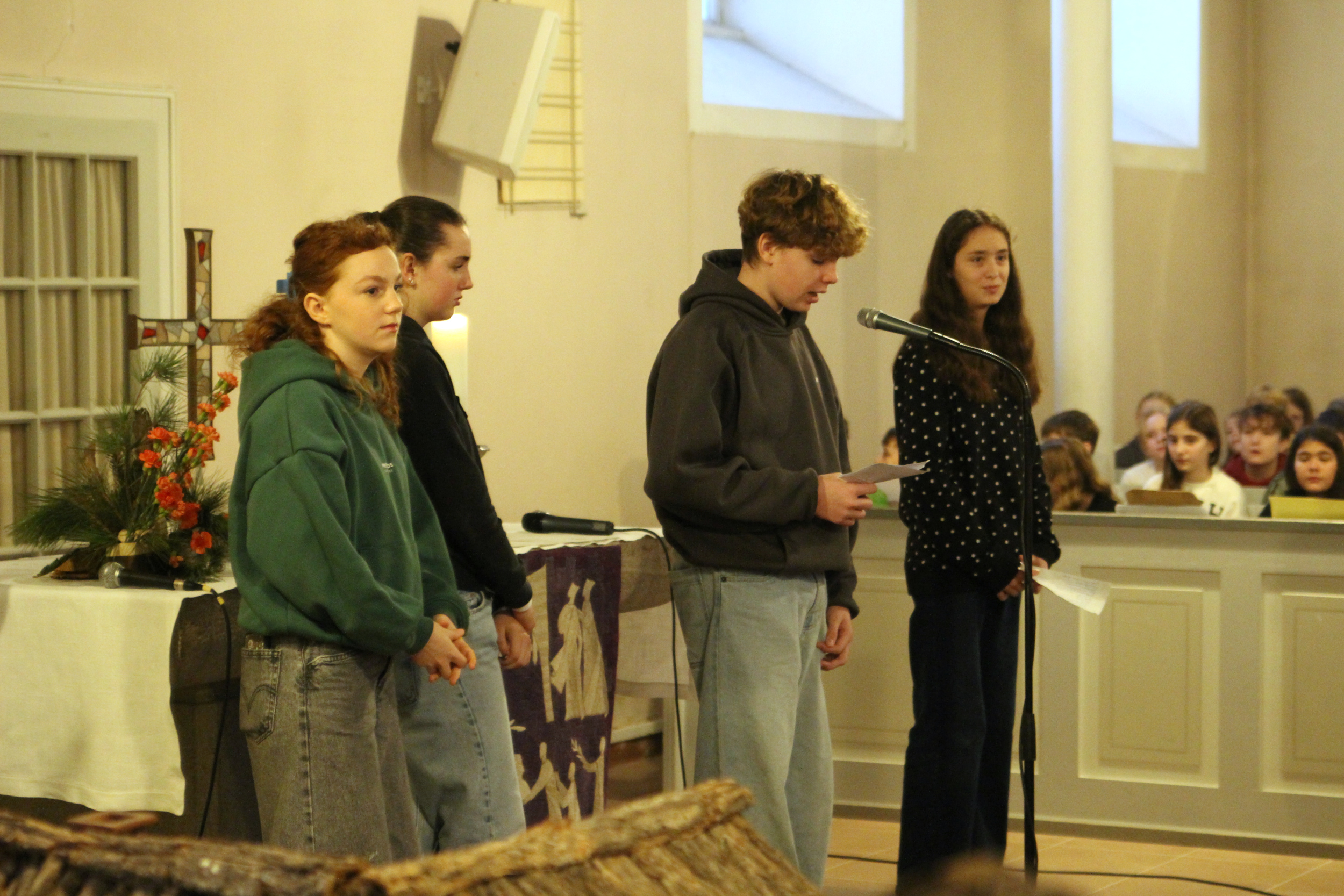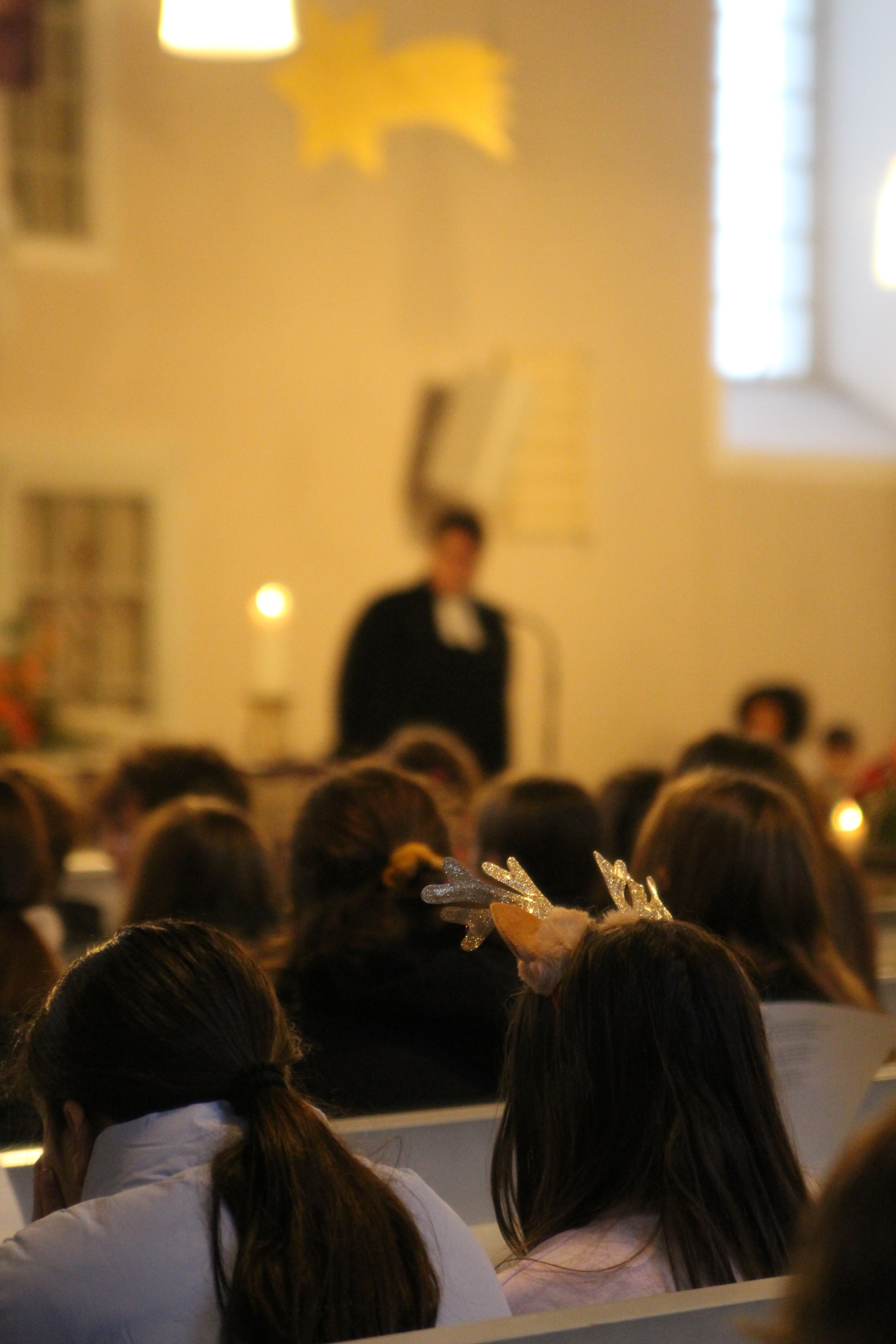 Auch die Lesung der biblischen Weihnachtsgeschichte, die Fürbitten, das Vater Unser und der Segen lagen in der Hand der Gottesdienstlotsen. Pfarrer Peter Wagner nahm die Gedanken des Anspiels in seiner Ansprache auf: „Gott schenkt sich uns in Jesus Christus, vor einem Kind braucht man sich nicht zu fürchten, da schmelzen Herzen, darüber freut man sich.“ Die fröhliche, entspannte Atmosphäre des Gottesdienstes wurde auch in den musikalischen Beiträgen sichtbar: Unter Leitung von Dorothea Kempf und Florian Wind-Giesewetter erklangen die Stimmen der Singklassen 5c und 6c mit „12 Days of Christmas“ und „Weihnachten, was bist du“. Auch zwei Lernende der Oberstufe unterstützen unseren Gottesdienst: Maya und Marlon gelang es, am Ende des Gottesdienstes noch eine eine ganz besonders festliche Atmosphäre zu zaubern, mit ihrem Lied „Christmas Lullaby“.