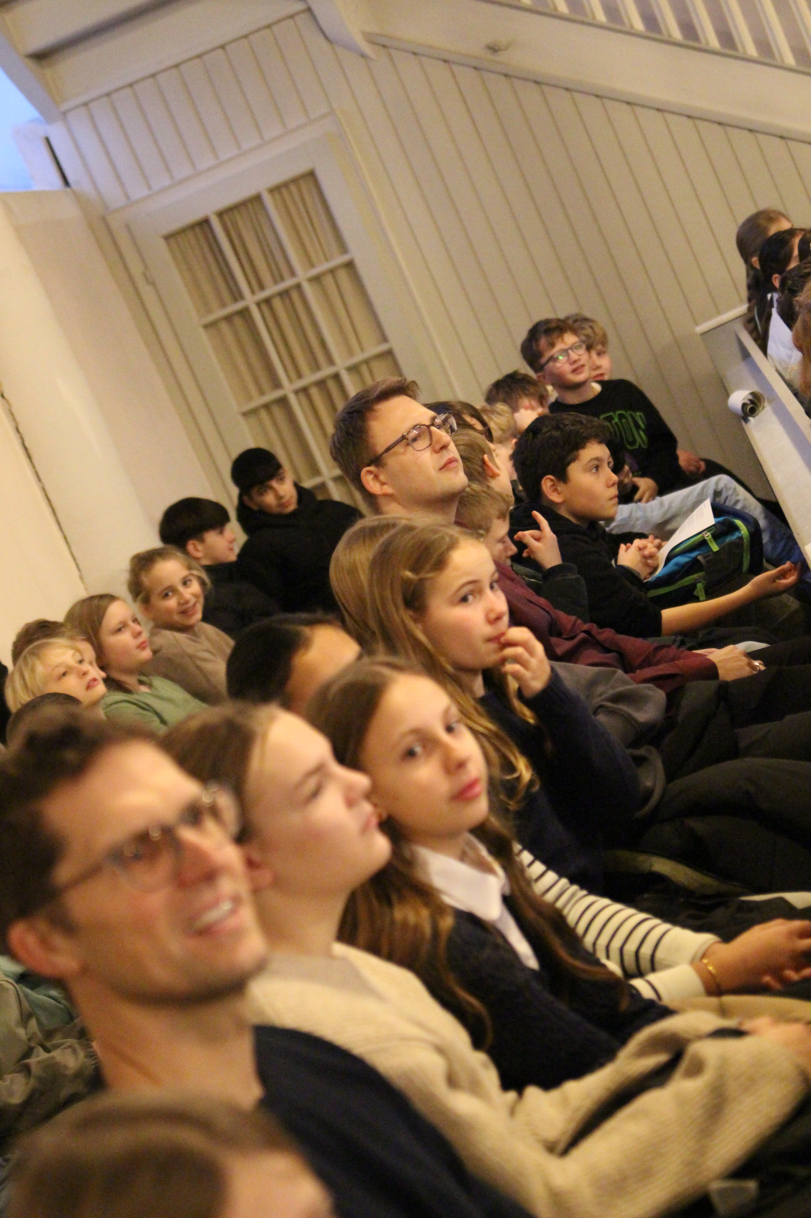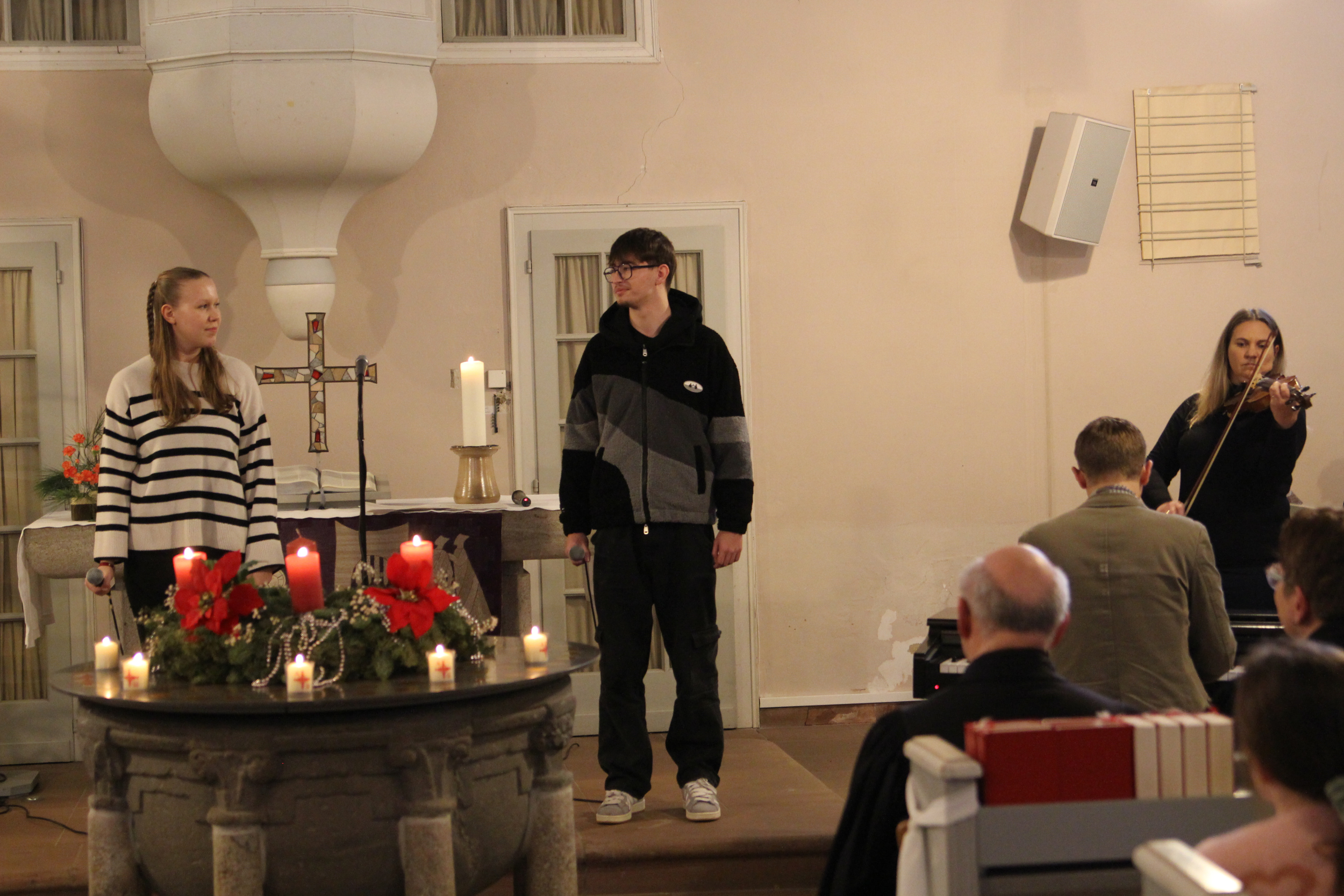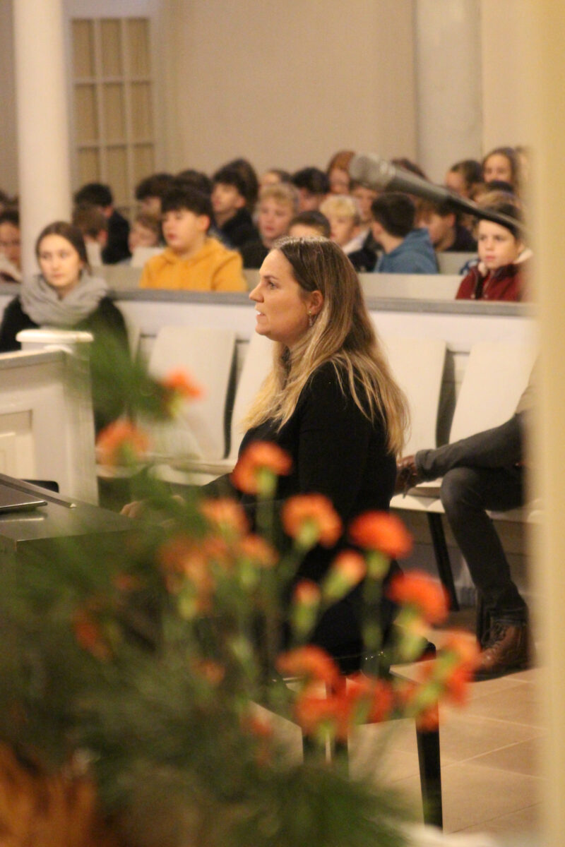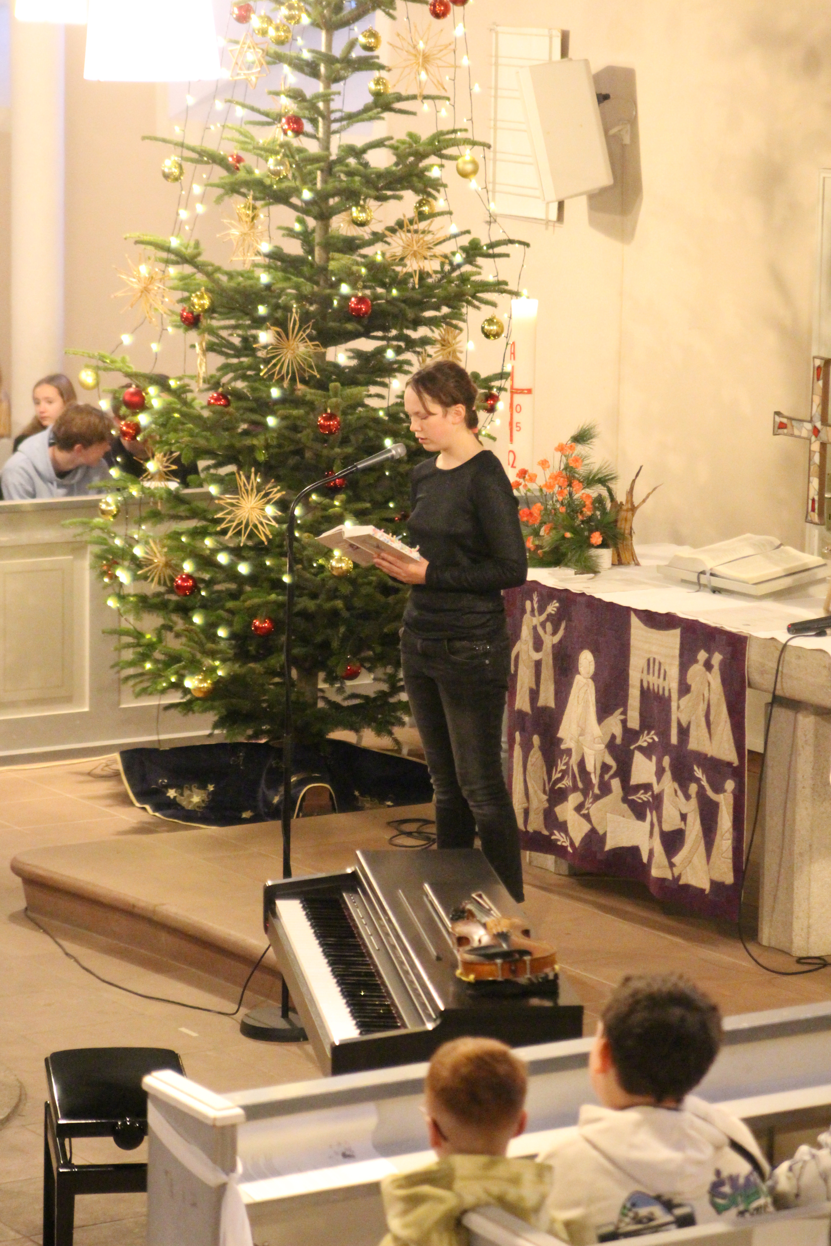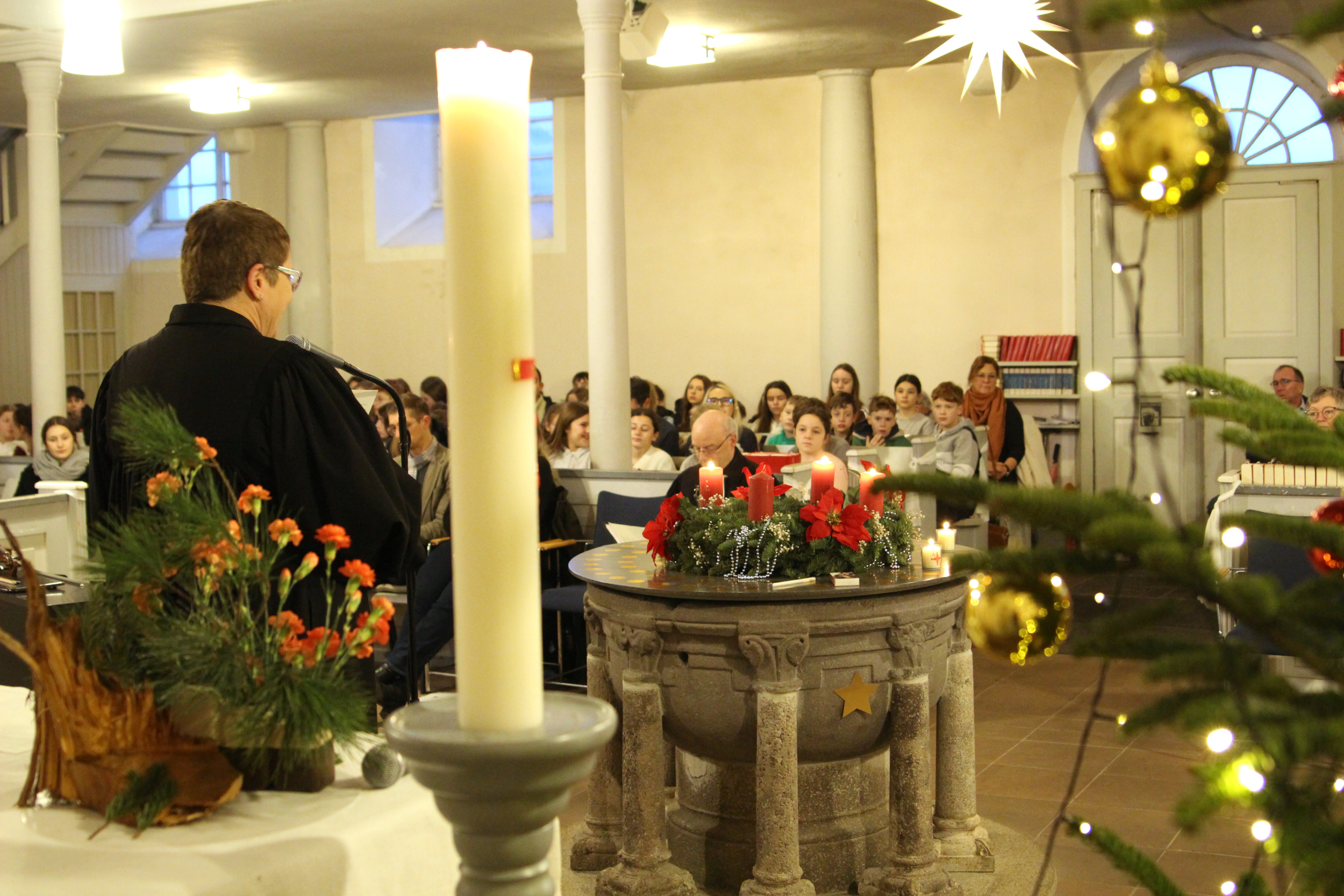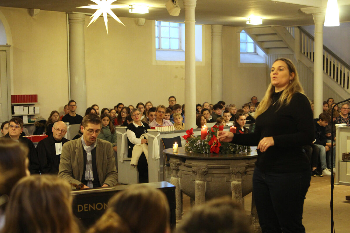 Auch die Lesung der biblischen Weihnachtsgeschichte, die Fürbitten, das Vater Unser und der Segen lagen in der Hand der Gottesdienstlotsen. Pfarrer Peter Wagner nahm die Gedanken des Anspiels in seiner Ansprache auf: „Gott schenkt sich uns in Jesus Christus, vor einem Kind braucht man sich nicht zu fürchten, da schmelzen Herzen, darüber freut man sich.“ Die fröhliche, entspannte Atmosphäre des Gottesdienstes wurde auch in den musikalischen Beiträgen sichtbar: Unter Leitung von Dorothea Kempf und Florian Wind-Giesewetter erklangen die Stimmen der Singklassen 5c und 6c mit „12 Days of Christmas“ und „Weihnachten, was bist du“. Auch zwei Lernende der Oberstufe unterstützen unseren Gottesdienst: Maya und Marlon gelang es, am Ende des Gottesdienstes noch eine eine ganz besonders festliche Atmosphäre zu zaubern, mit ihrem Lied „Christmas Lullaby“.
