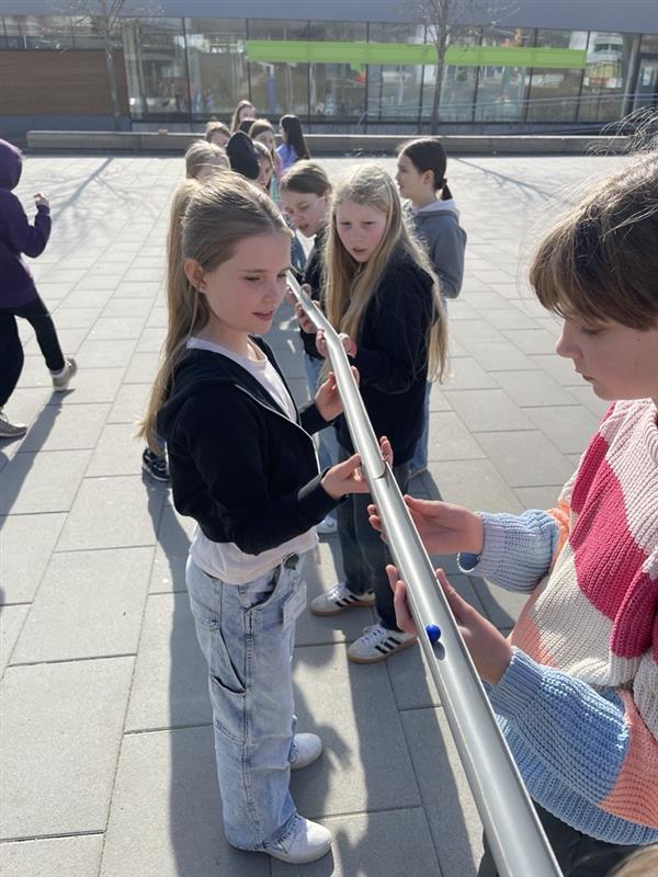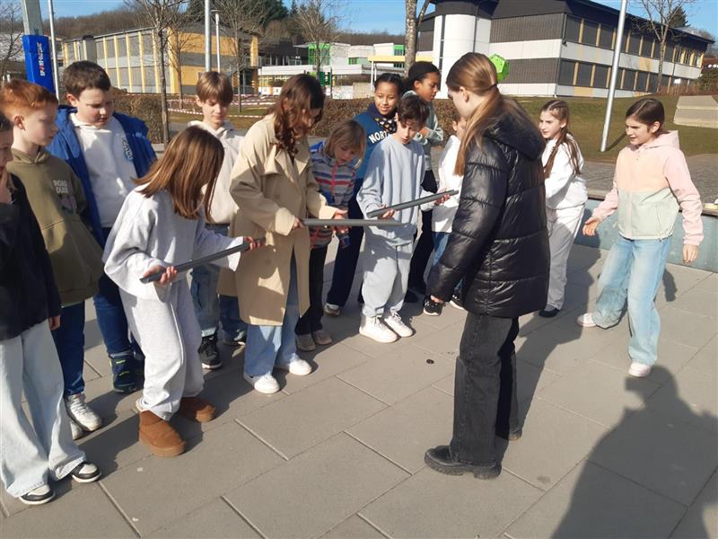 Im Anschluss wurde mit drei weiteren Spielen die ganze Klasse als großes Team herausgefordert. So mussten die SuS beim Spiel „Codeknacker“ gemeinsam einen dreißigstelligen Geheimcode knacken und ordnen. Im Anschluss mussten zwei Murmeln sicher mithilfe von kurzen Rinnenabschnitten an ein Ziel, eine einige Meter entfernte Holzkiste, gebracht werden. Bei „Titanic“ mussten sich alle über Eisschollen auf den Eisberg retten. Nicht alle Spiele konnten erfolgreich gemeistert werden, aber alle Spiele forderten den Teamgeist aller Klassenmitglieder und gaben treffende Anlässe, am Ende des Tages zu reflektieren, wie man als Team noch besser zusammenarbeiten und innerhalb der Gruppe kommunizieren kann.
