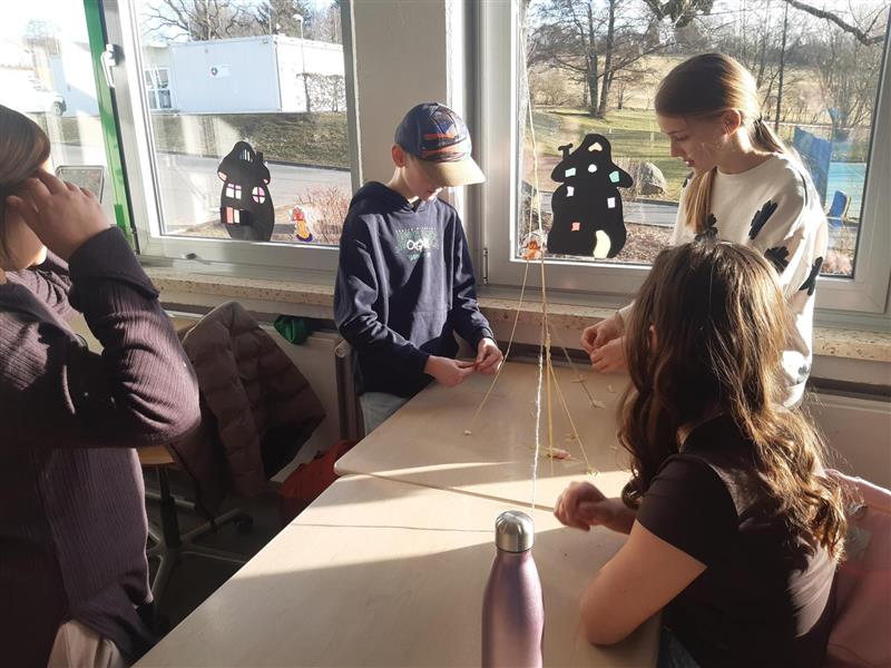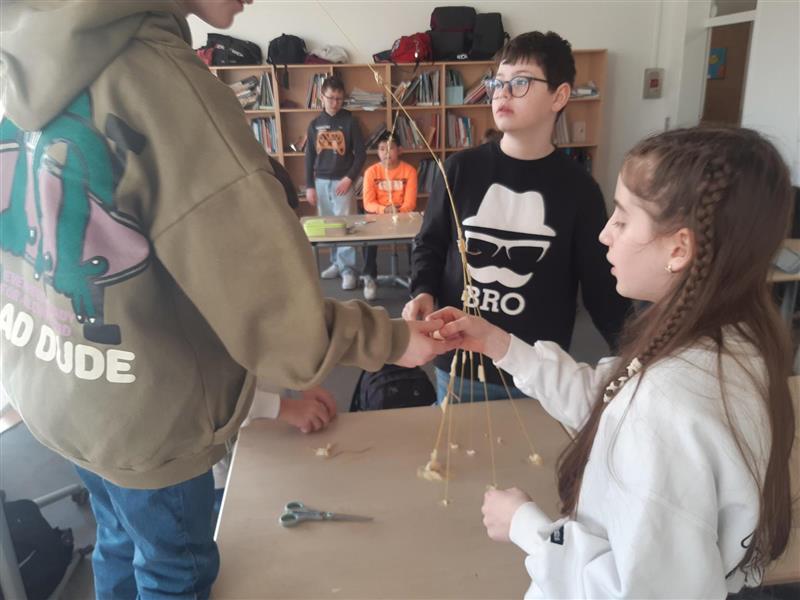Der zweite Tag stand dann ganz im Zeichen der Anwendung und des Ausprobierens des neu Gelernten. Bei der „Marshmallow-Challenge“ sollten in Gruppen mithilfe von Spaghetti, Marshmallows und Klebeband ein möglichst hoher Turm errichtet werden. Am Ende konnte eine Gruppe aus der 5b mit 107cm den höchsten Turm vorweisen und wurde Klassen- und Jahrgangssieger der Challenge. Als Belohnung für diese Anstrengung schmeckten die Sieges-Marshmallows besonders gut.